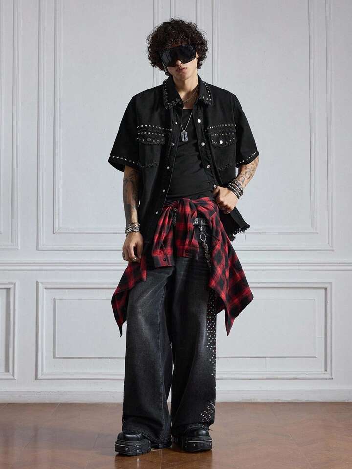 Street Life Camicia di jeans casual da uomo a maniche corte con bottoni e orli sfilacciati