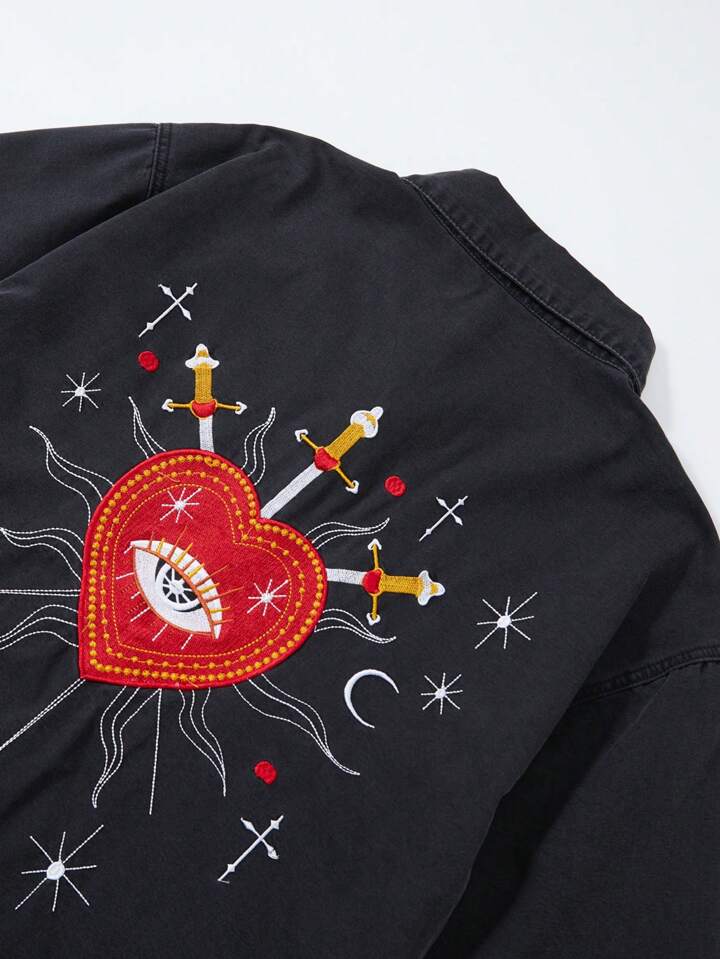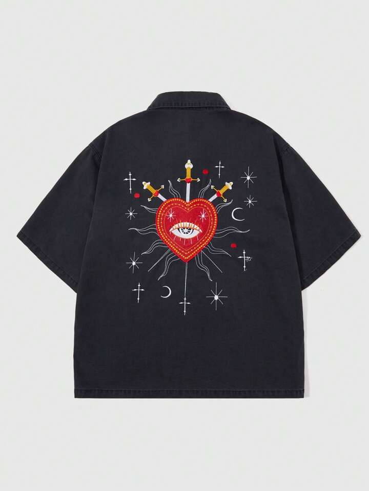 Street Life Camicia di jeans casual da uomo con ricamo a forma di cuore, estiva