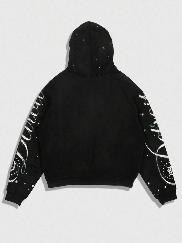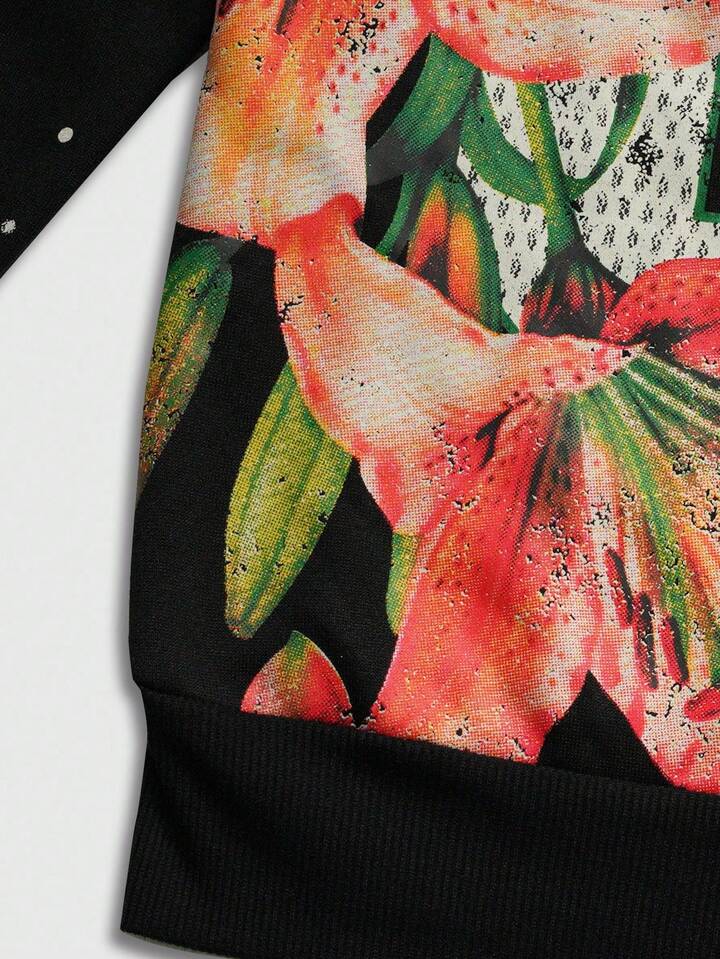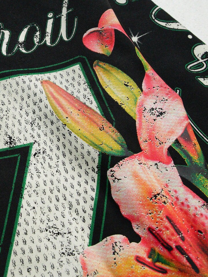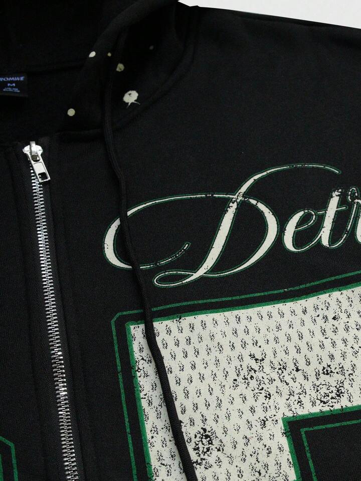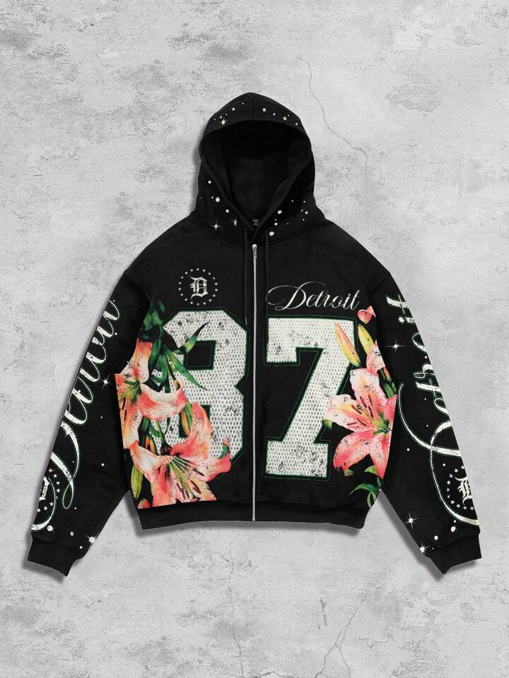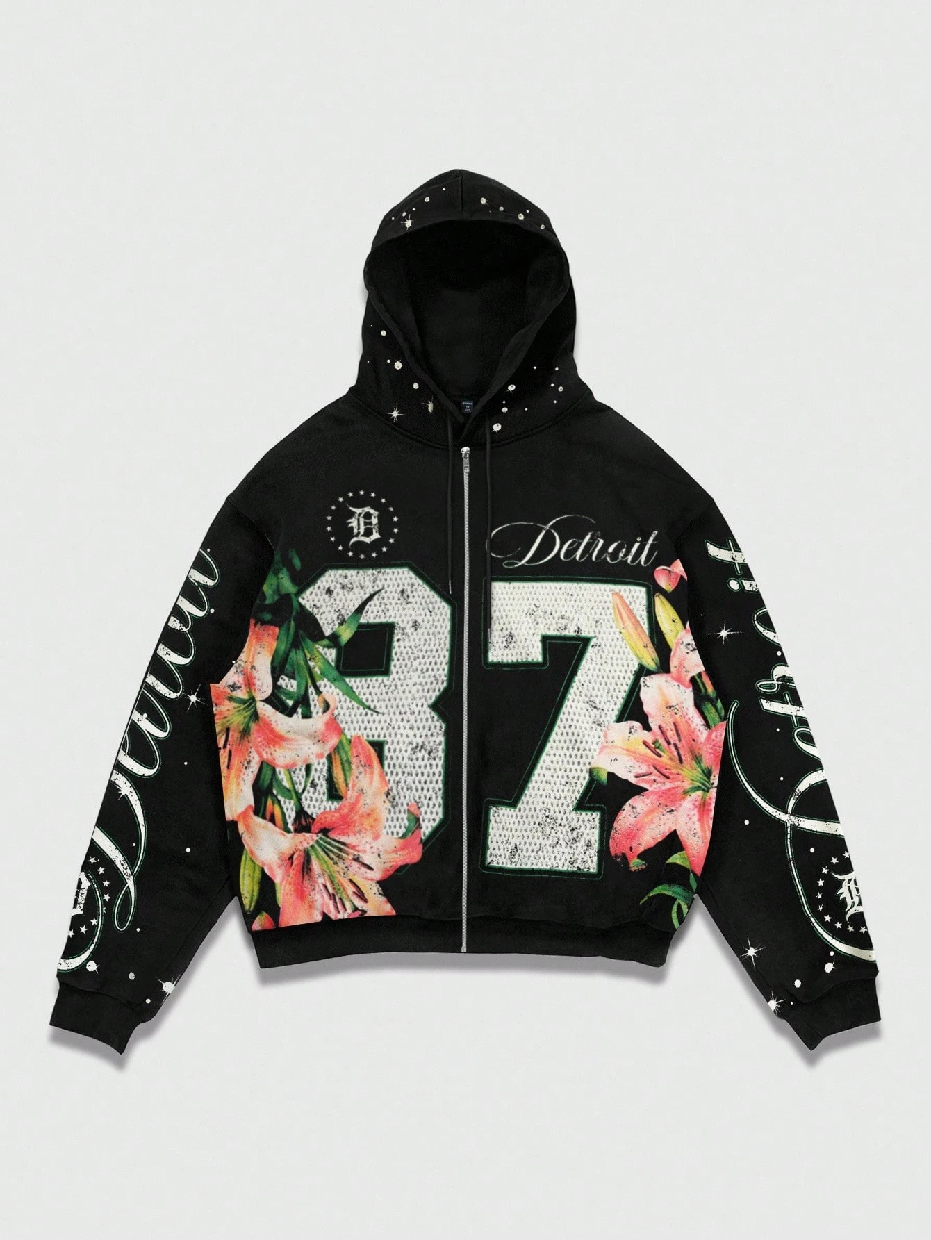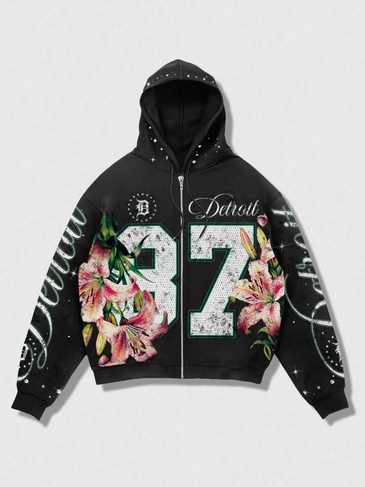 Street Life Felpa con cappuccio casual da uomo con stampa floreale e lettera, chiusura lampo frontale, autunno inverno