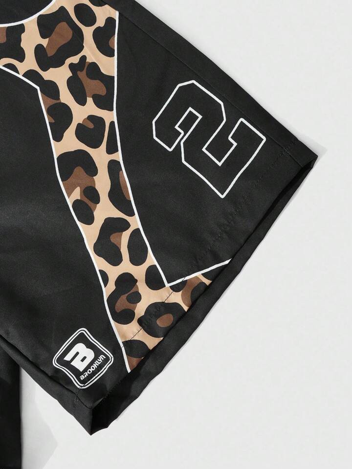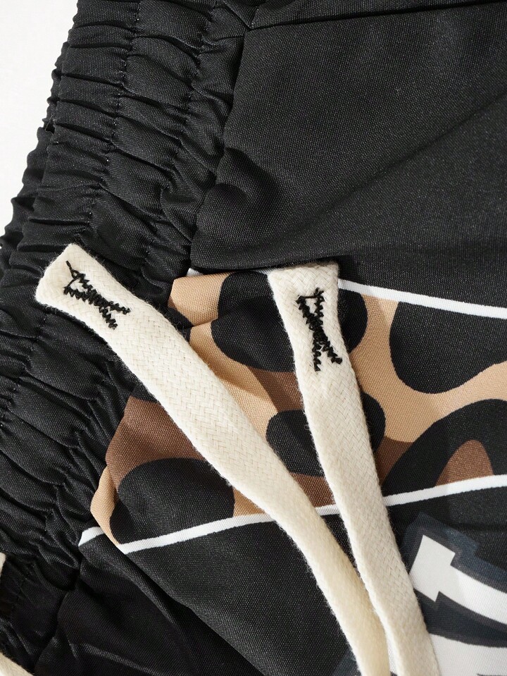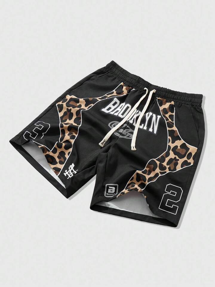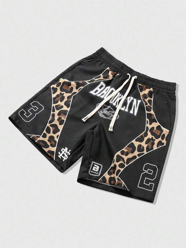Street Life Pantaloncini casual da uomo stile strada, con stampa leopardata e grafica con lettera inglese, effetto patchwork