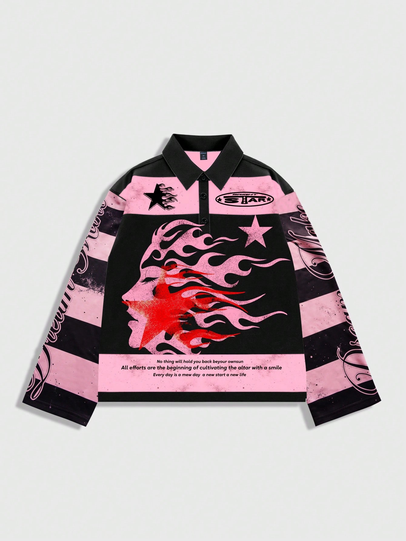 Street Life Maglietta a maniche lunghe con colletto a righe e stampa, stile casual da college per uomo