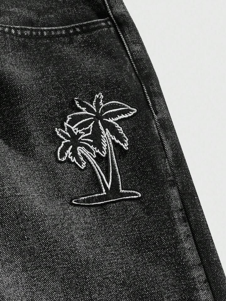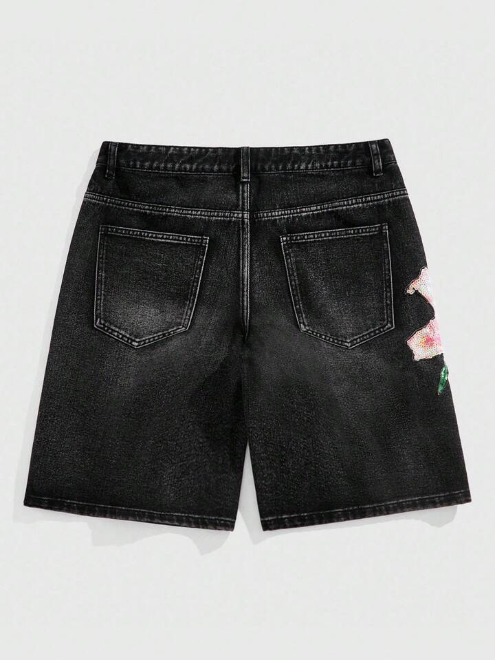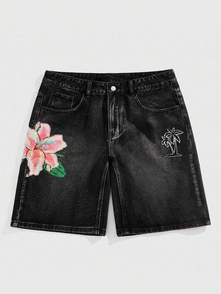 Street Life Pantaloncini di jeans da uomo estivi casual da strada, con motivo floreale e di palme in paillettes a contrasto