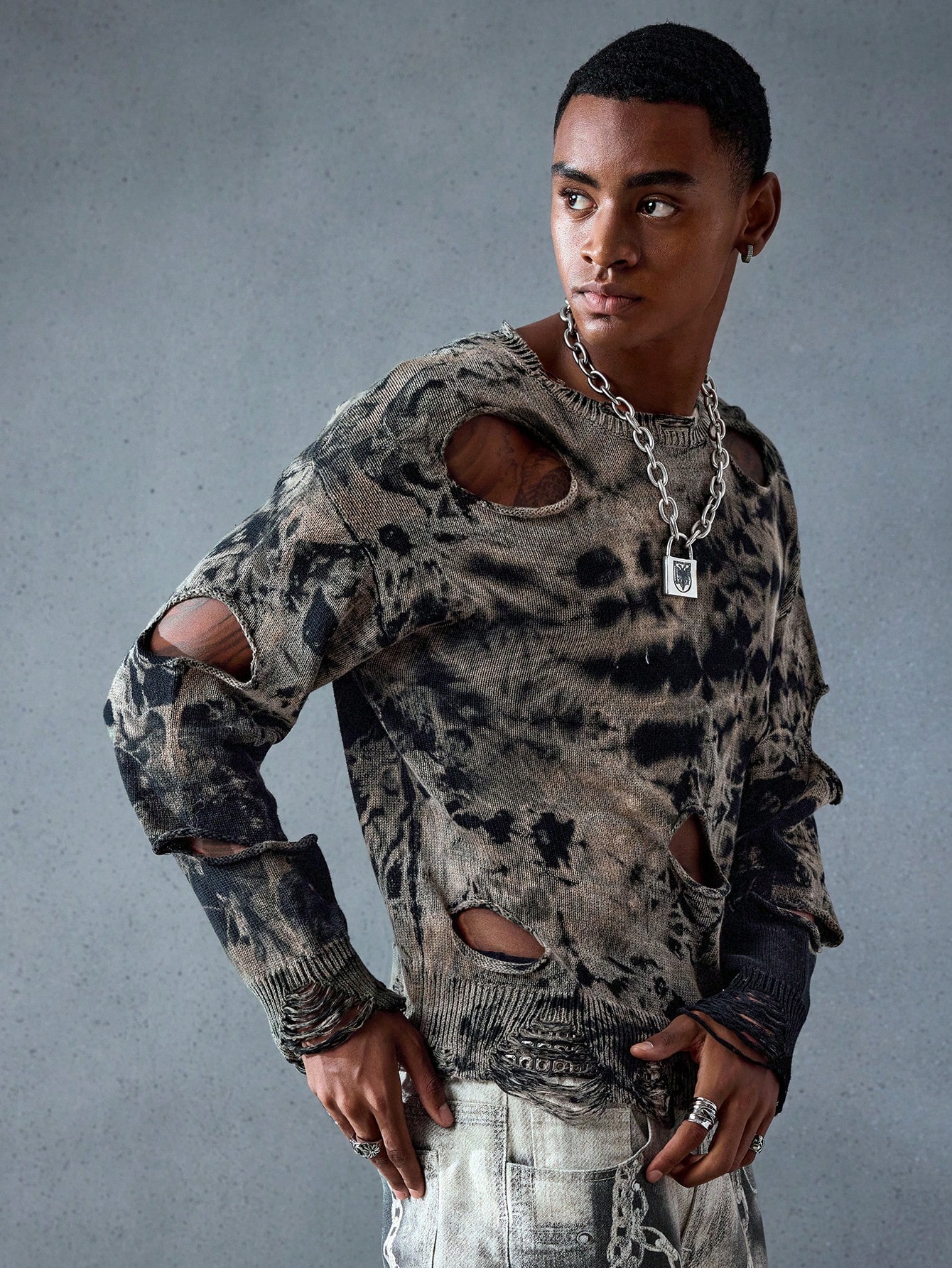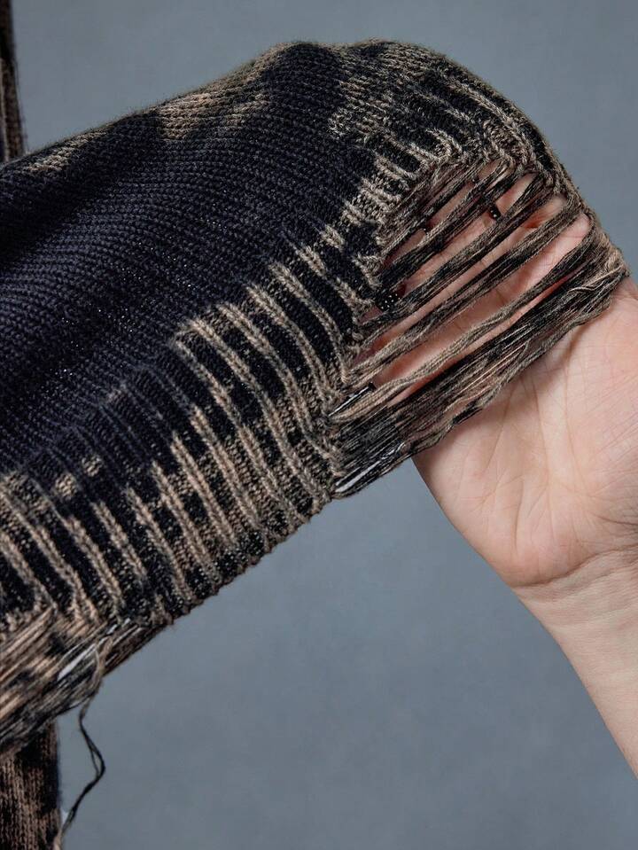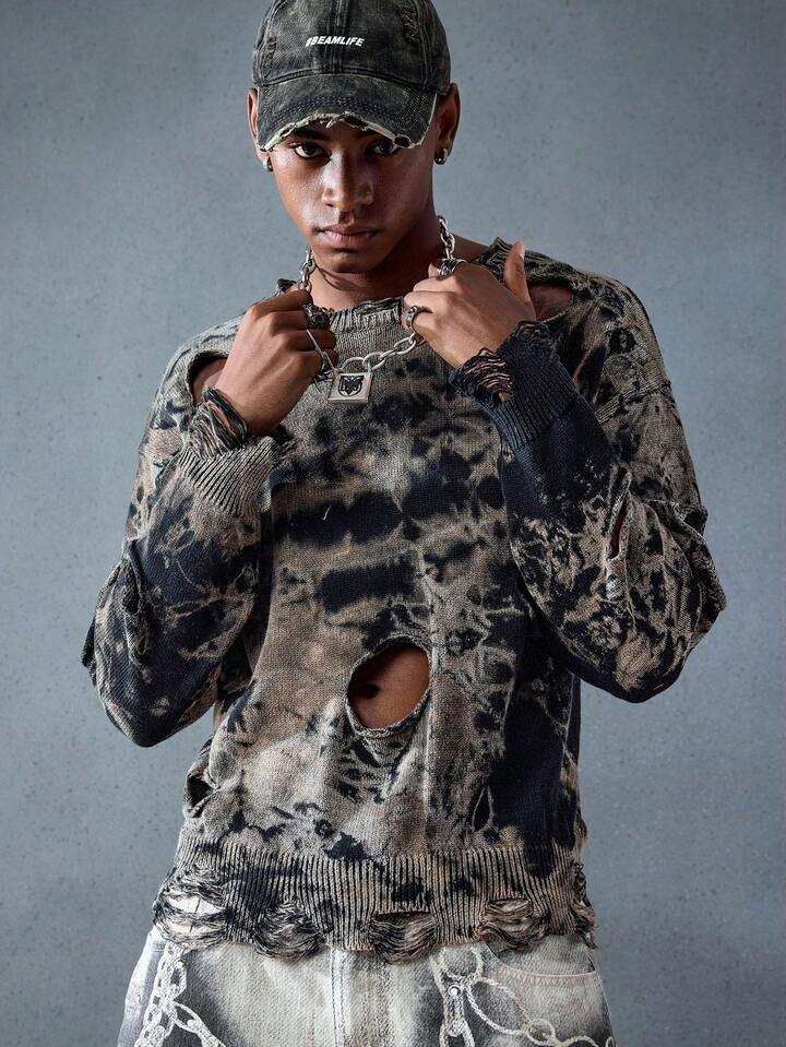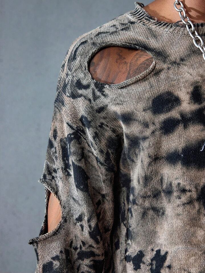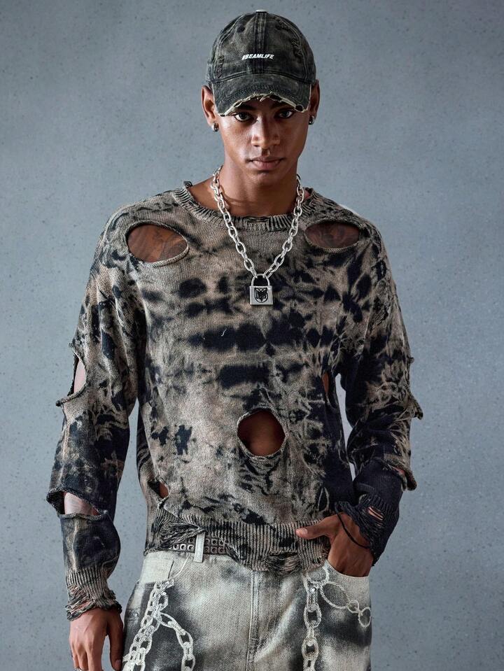 Street Life Maglione da uomo con motivo tie-dye, effetto casuale consumato, stile punk strappato e consumato