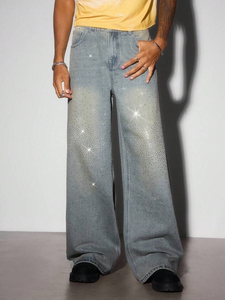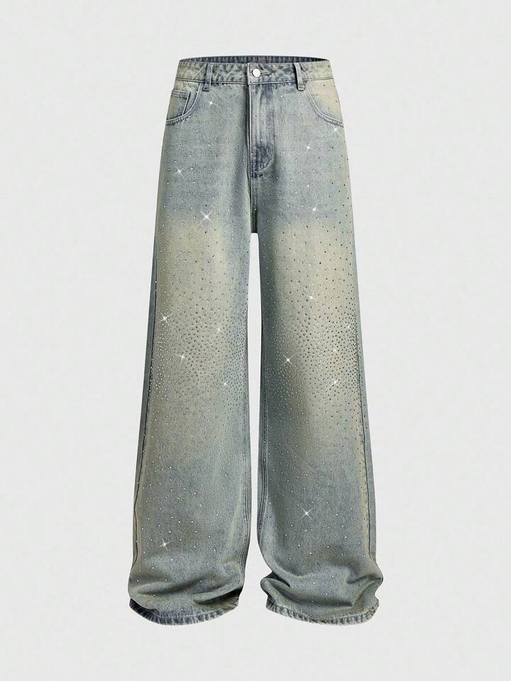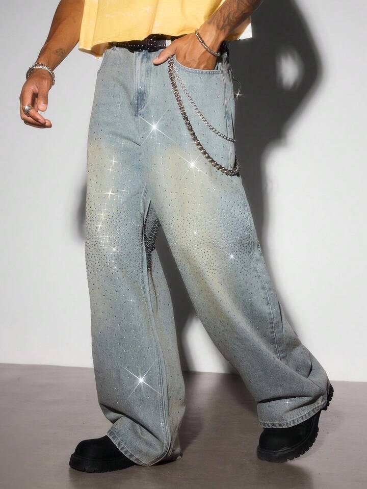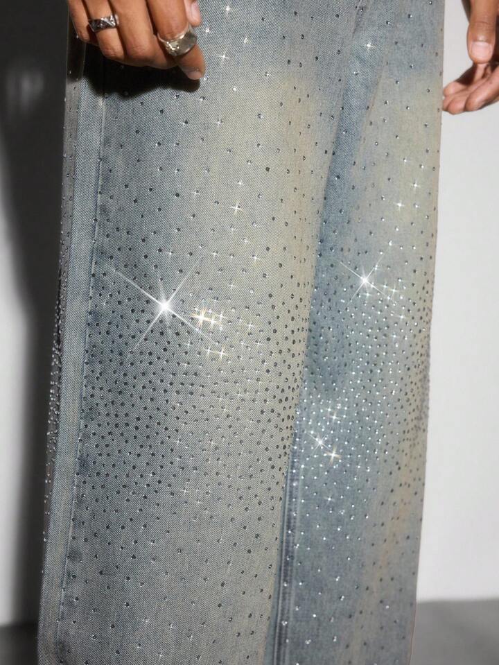 Street Life Jeans casual blu vintage con vestibilità morbida e strass luccicanti per uomo