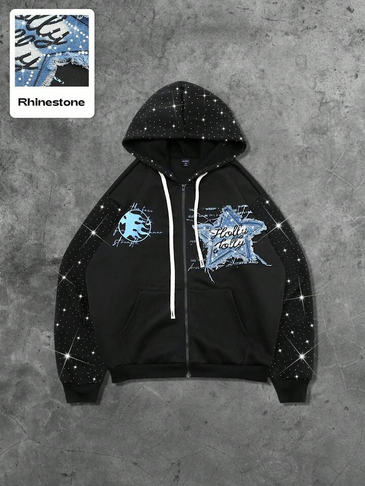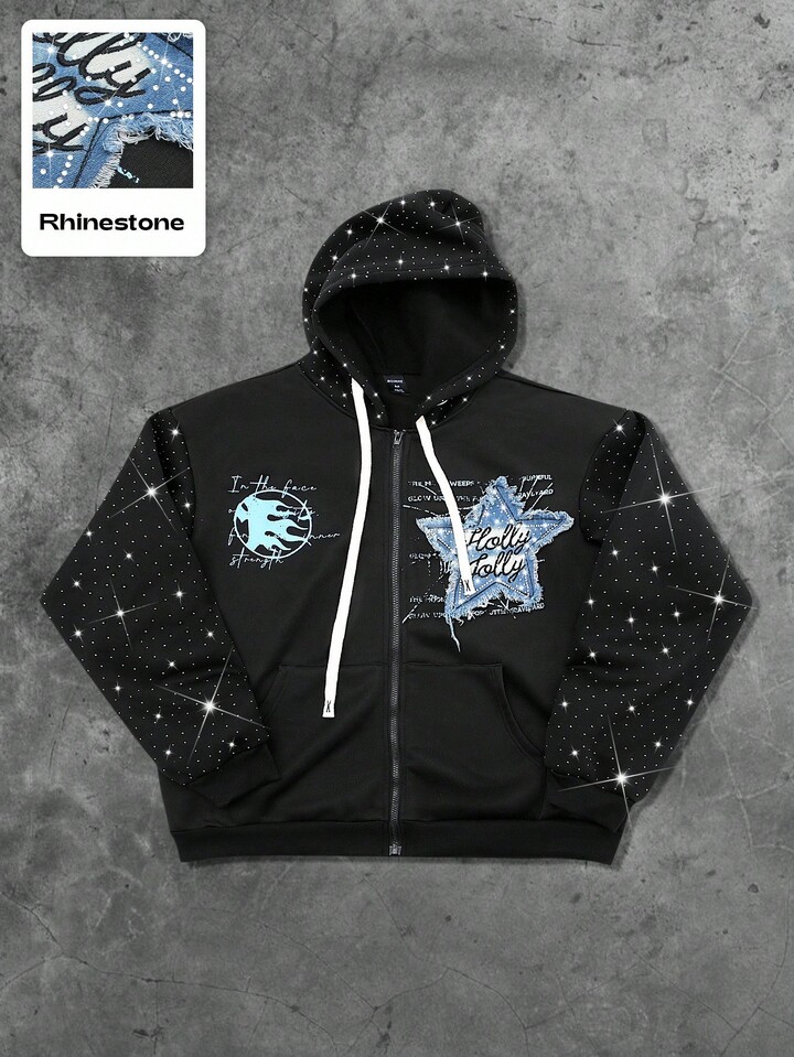 Street Life Felpa con cappuccio da uomo con chiusura lampo, stile di strada, ricamo di strass americano, stampa grafica in inglese, felpa con cappuccio per autunno/inverno