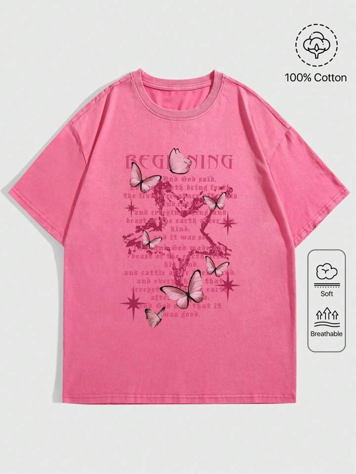 Street Life T-shirt con stampa collage di elementi Farfalla in Stile Punk Gotico, con carattere gotico, neve casuale a macchia con farfalla e fulmine