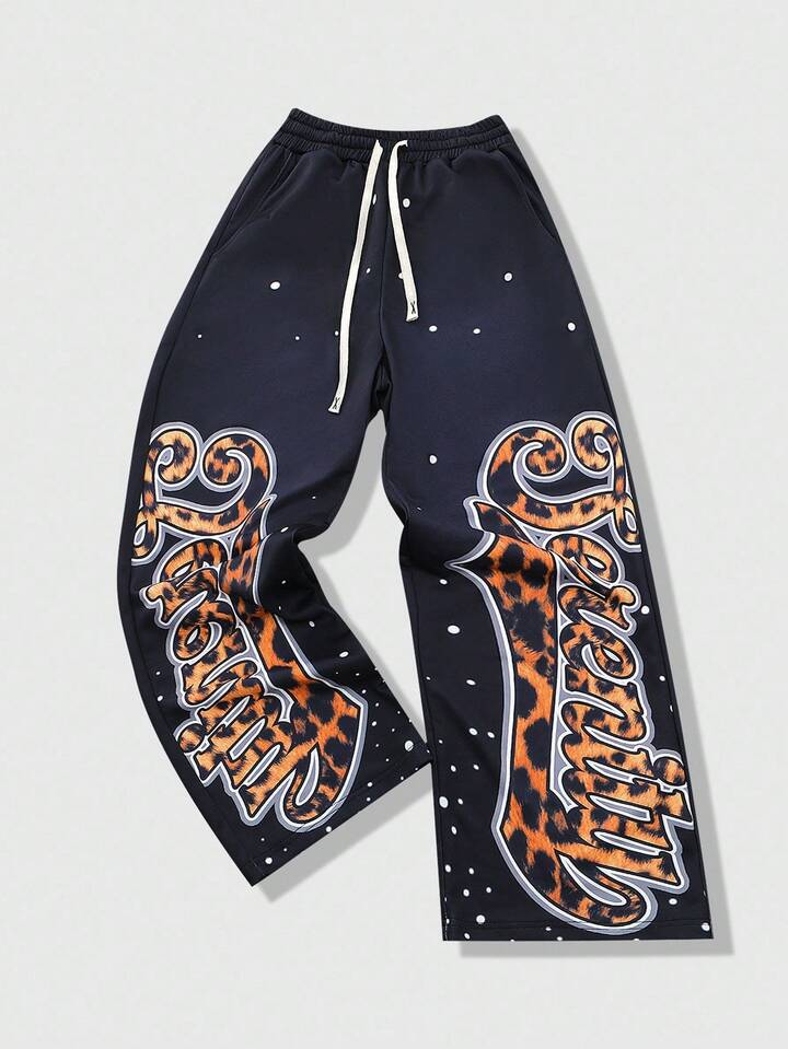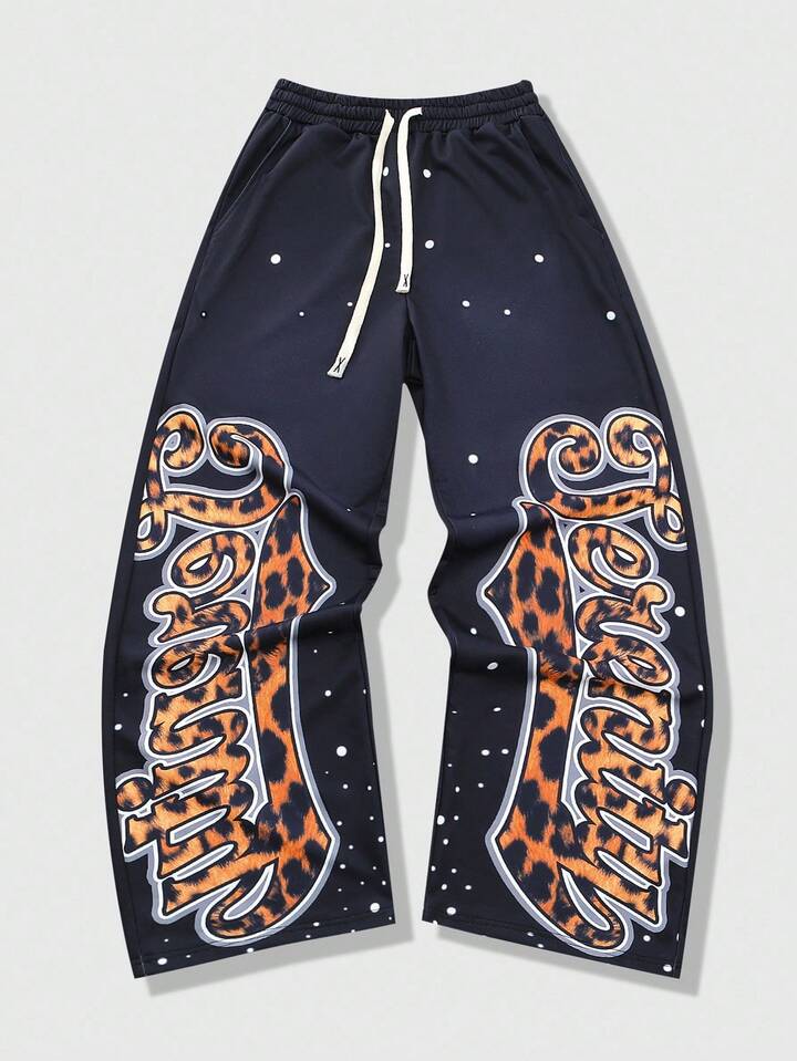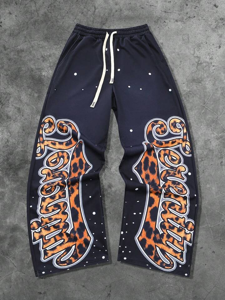 Street Life Pantaloni della tuta dritti con stampa leopardata e grafica con testo in inglese, stile di strada, autunno/inverno, unisex