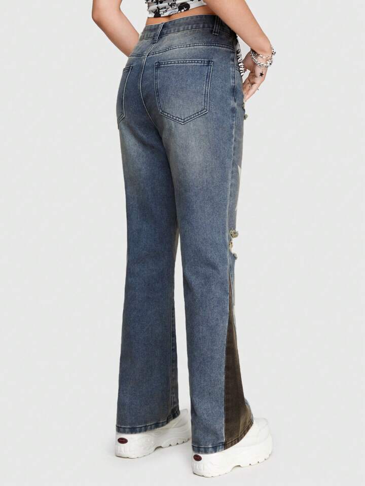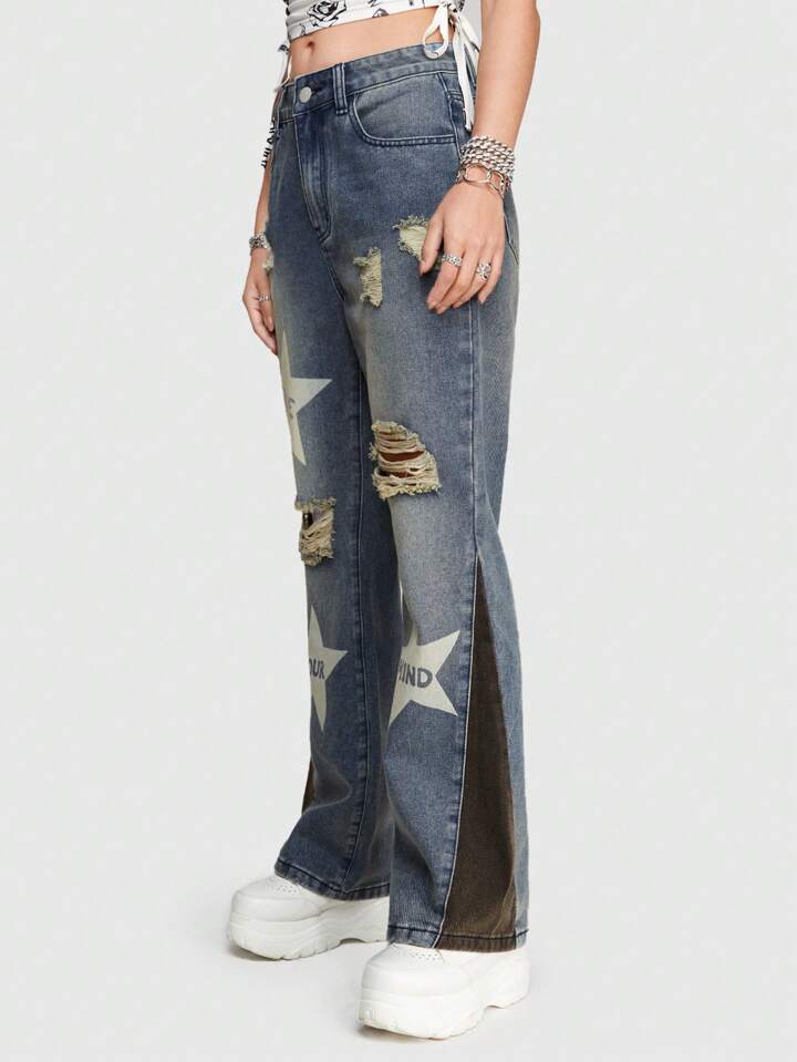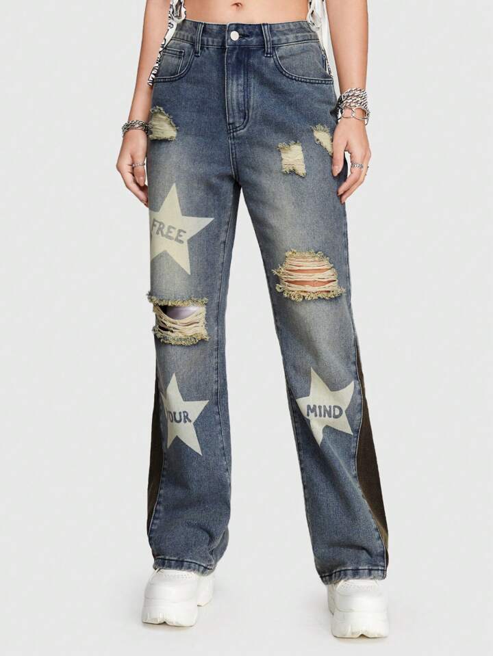 Street Life Jeans Da Donna Con Design Patchwork In Stile Streetwear Con Stampa Patch Featuring Stelle E Lettere