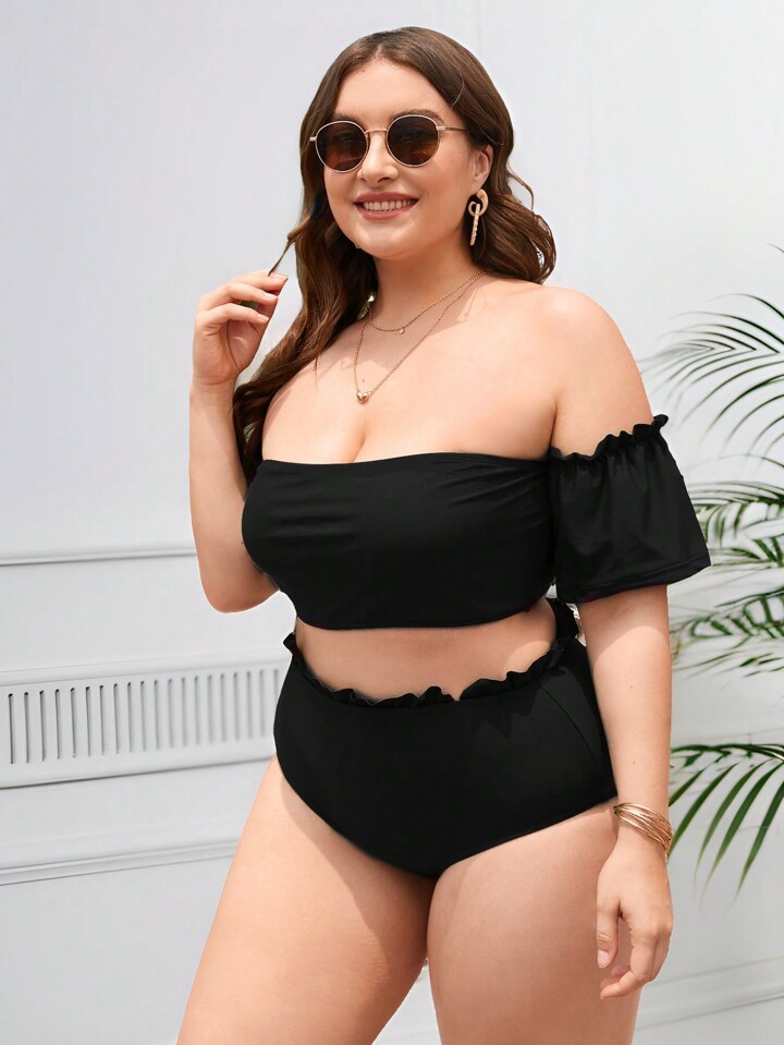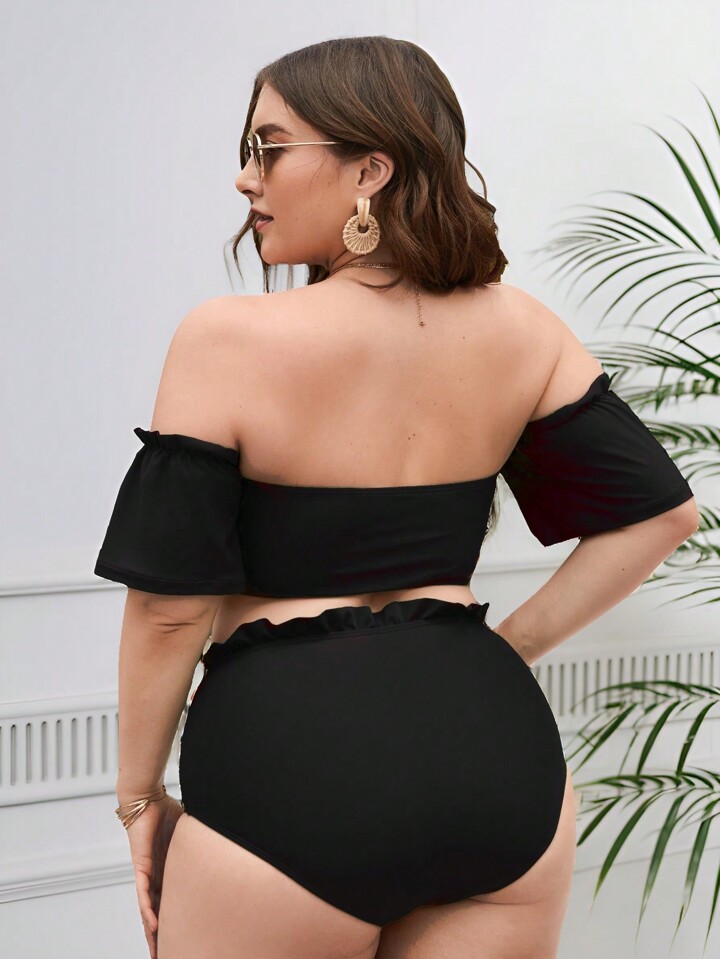 Taglie Forti Set bikini mono maniche corte volant Top con scollo bardot & Bottom vita alta Costume da bagno in 2 pezzi