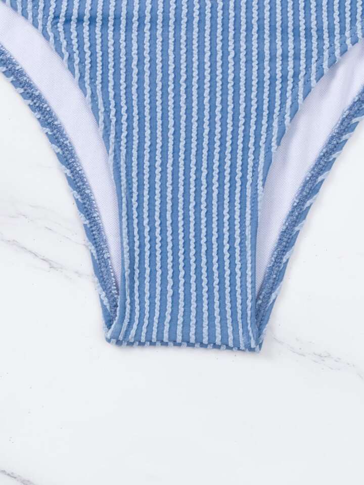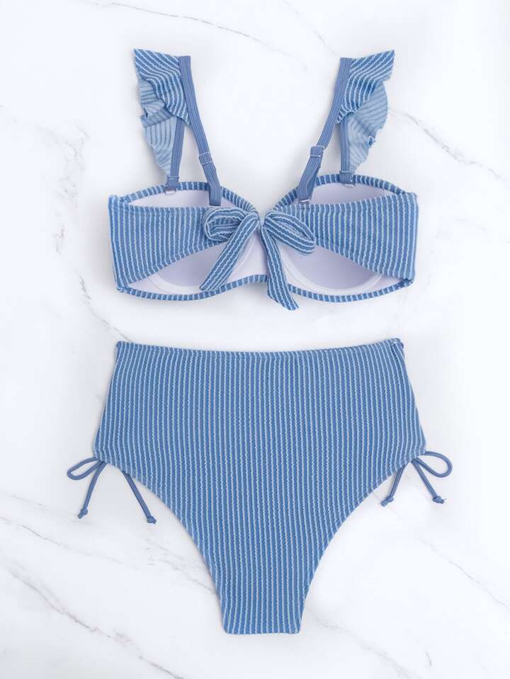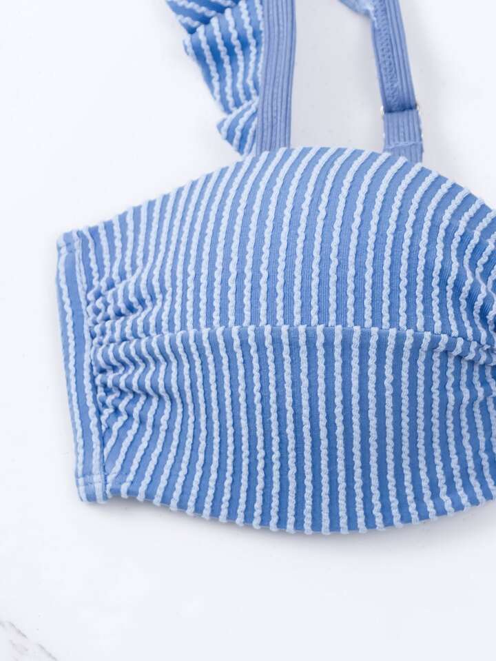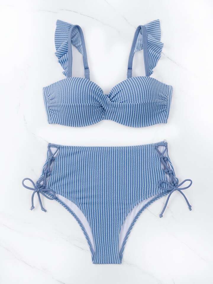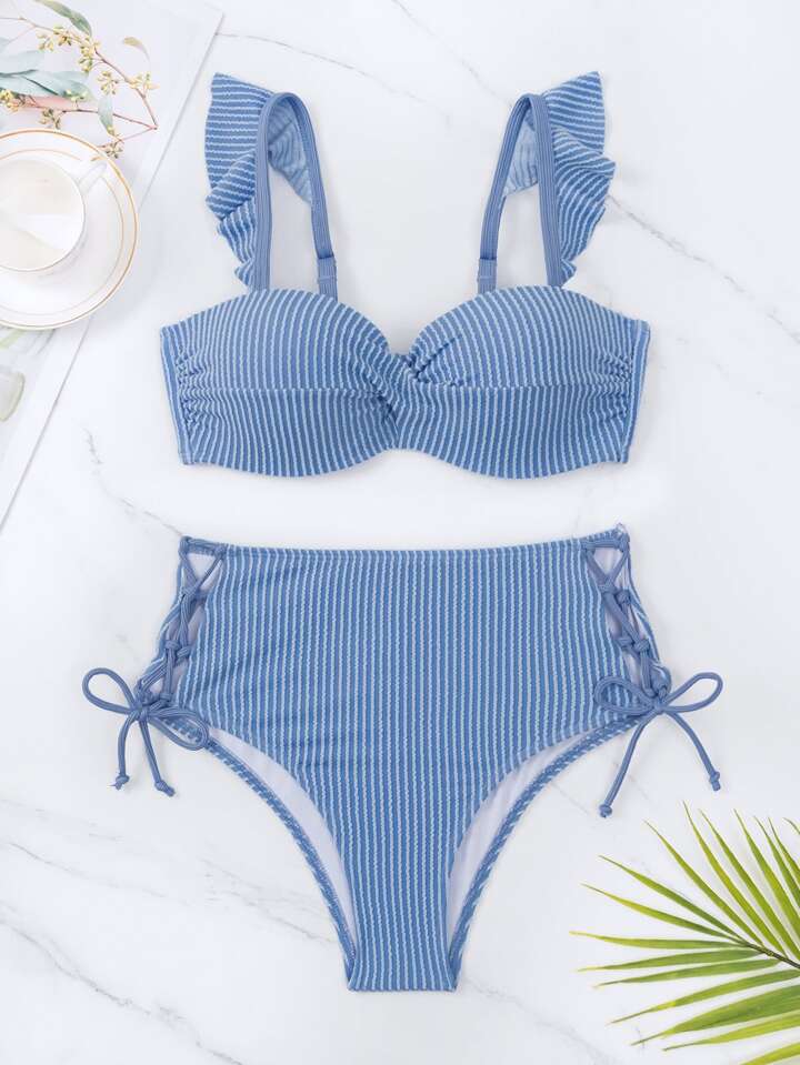 Set bikini estivo da spiaggia con arricciature a balze e lacci sui lati