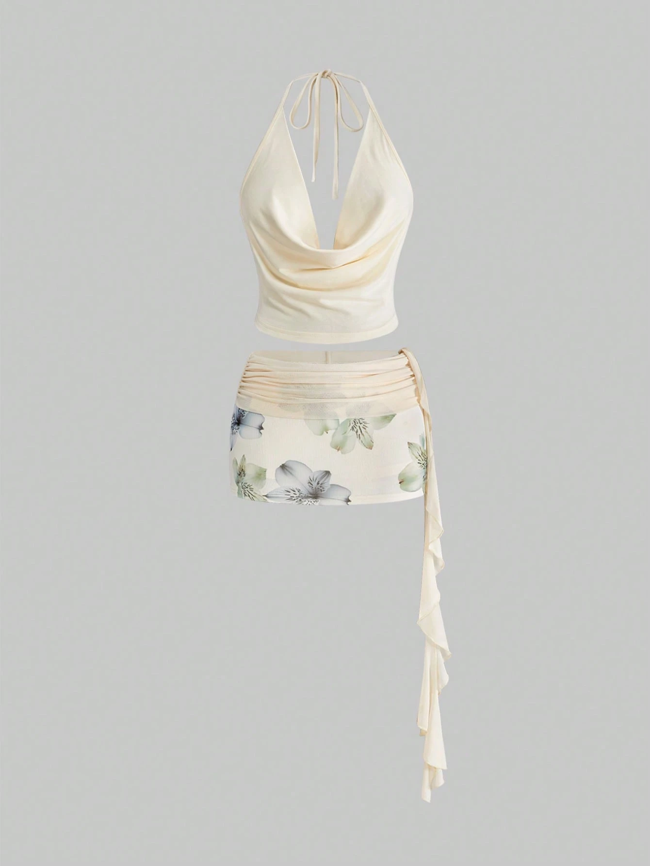 Set da 2 pezzi composto da canotta con scollo profondo a drappeggio e gonna a vita bassa con stampa floreale, spacco alto e orlo a coda di pesce, ideale per le vacanze estive