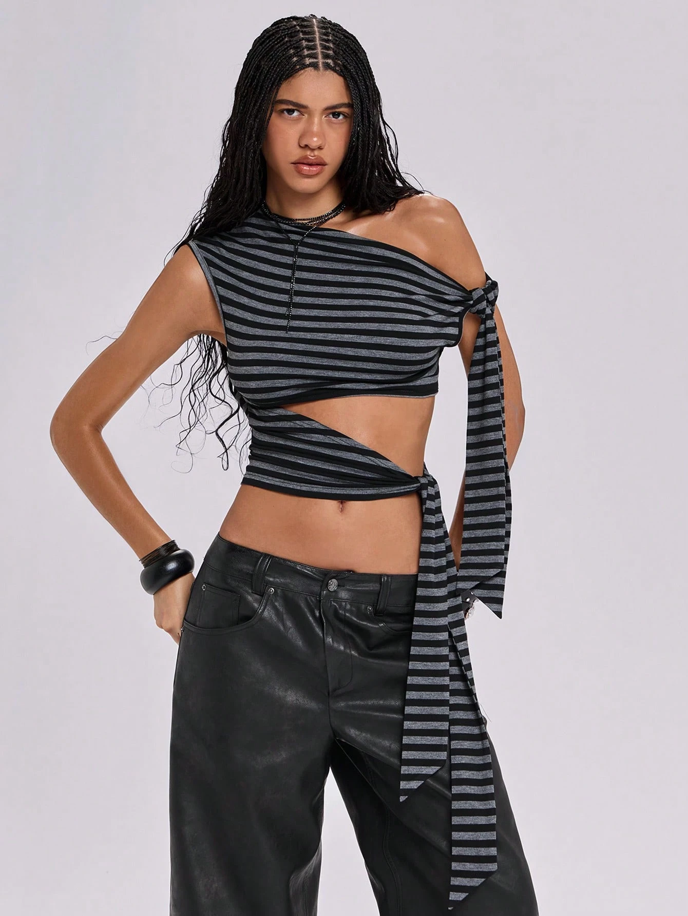 Top corto retrò sexy stile Y2K con lacci su spalle e vita, maglietta aderente a righe con spalla obliqua