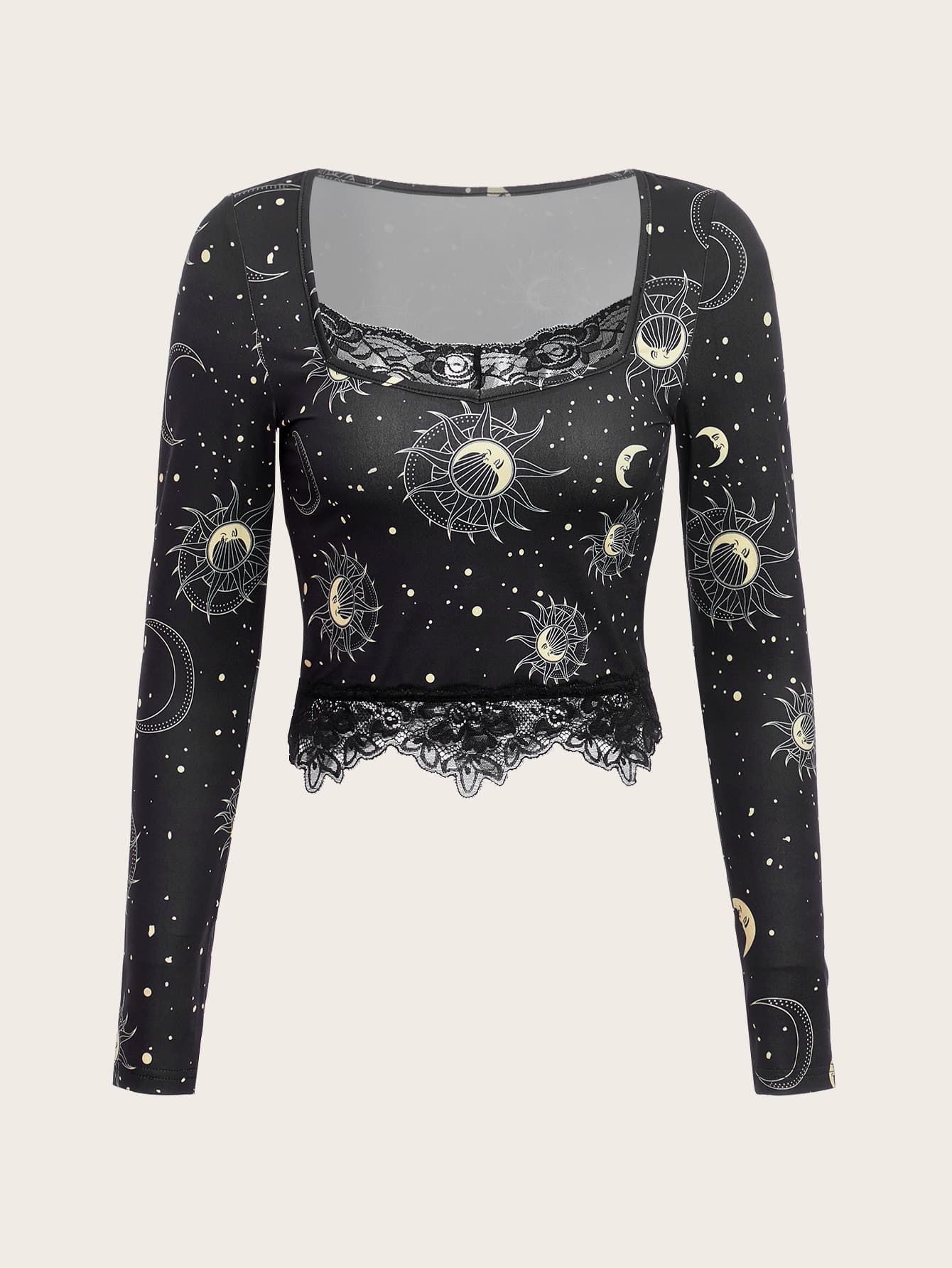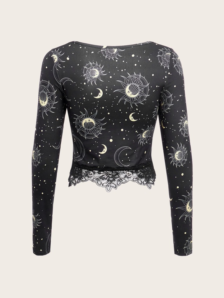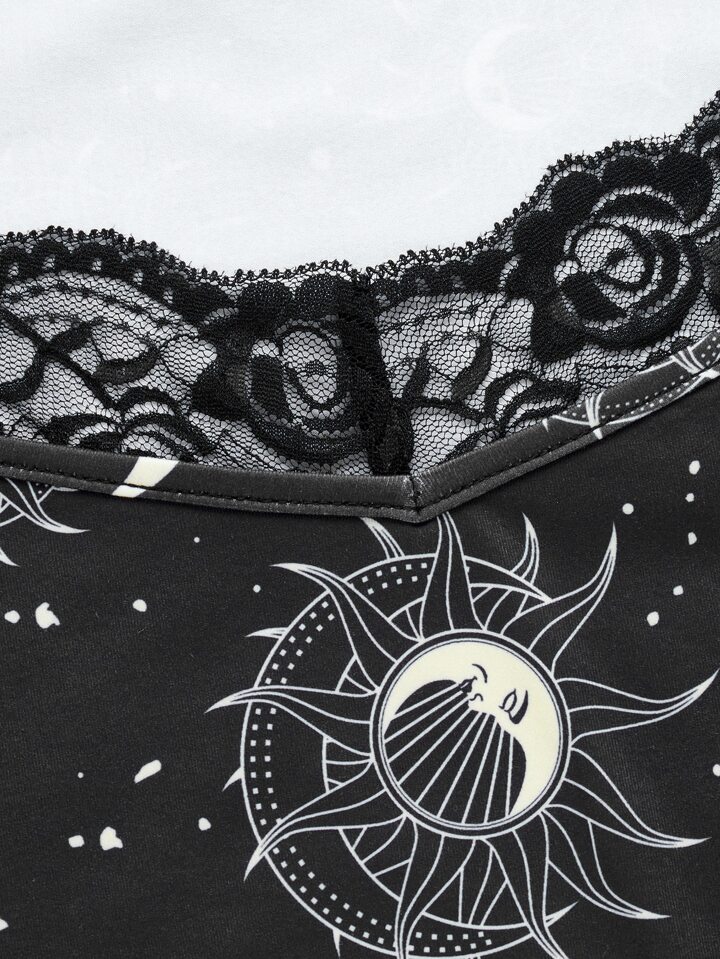Maglietta corta con grafica luna e sole pizzo a contrasto