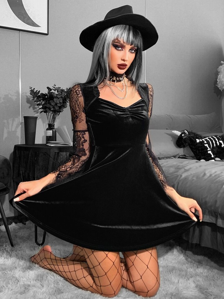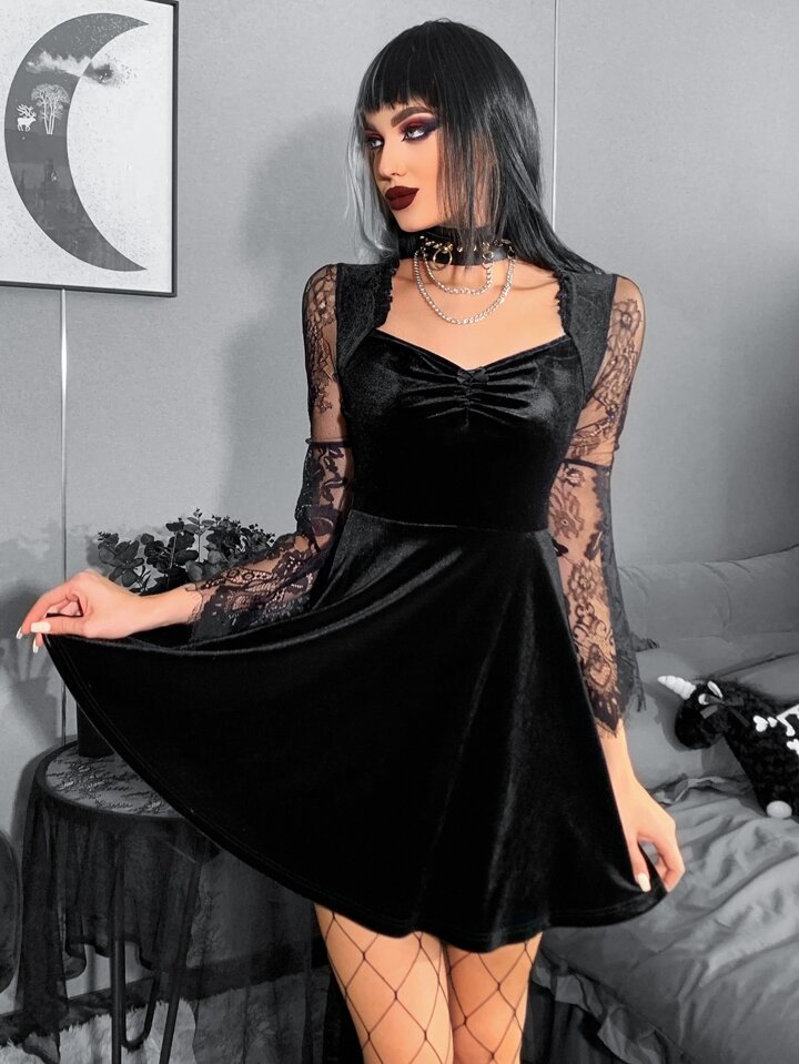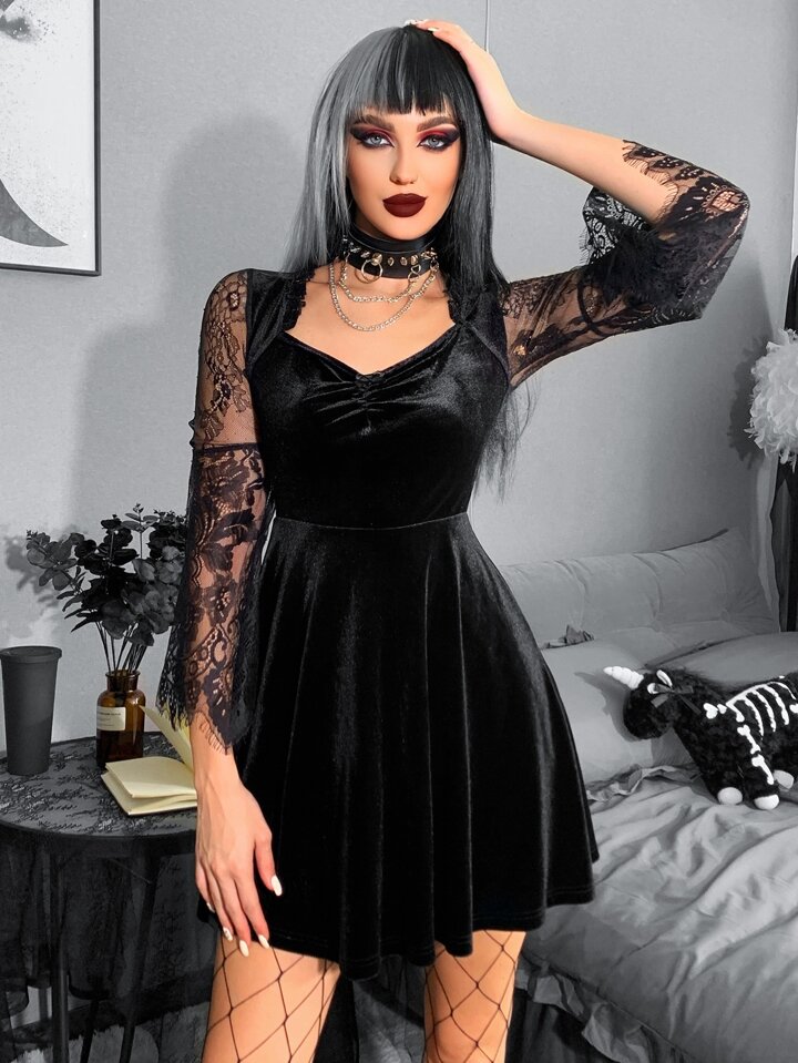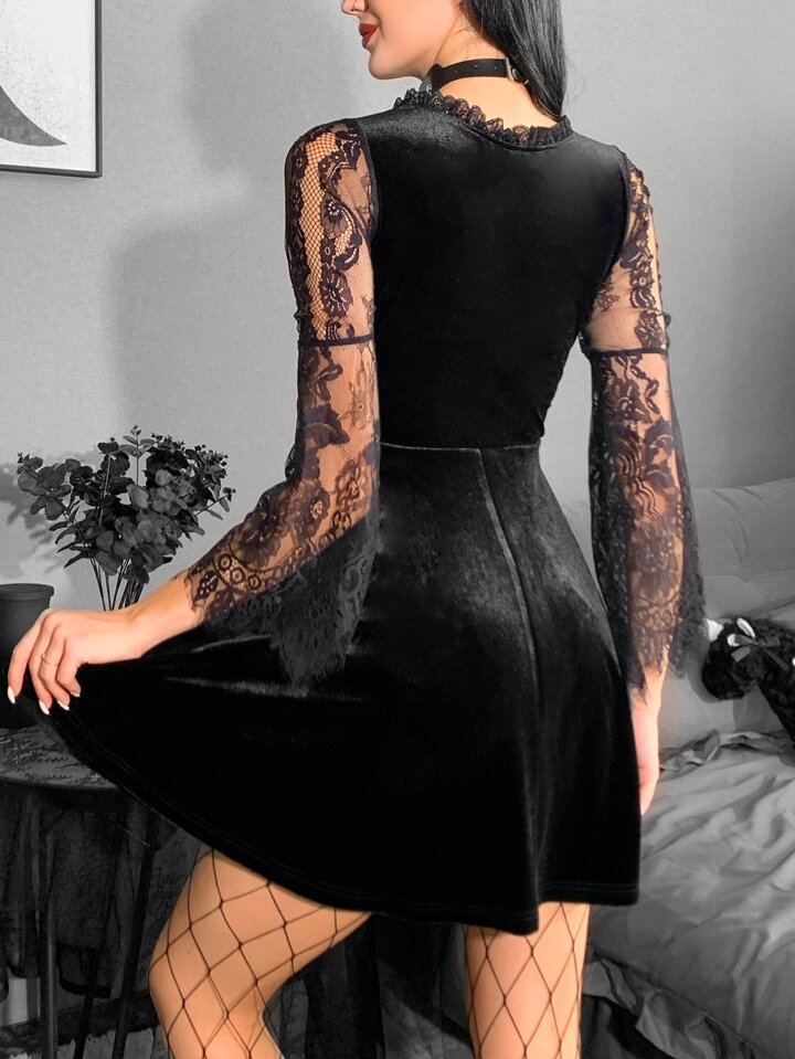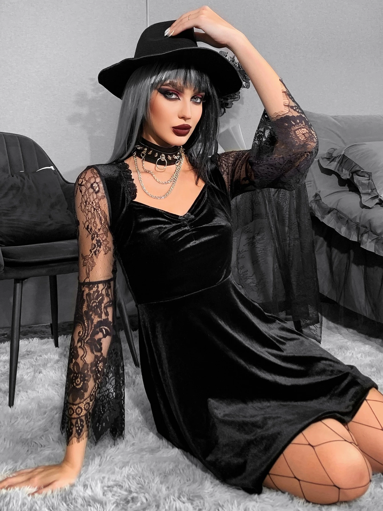 Abito collo a cuore pizzo ciglia maniche a campana bustino arricciato di velluto