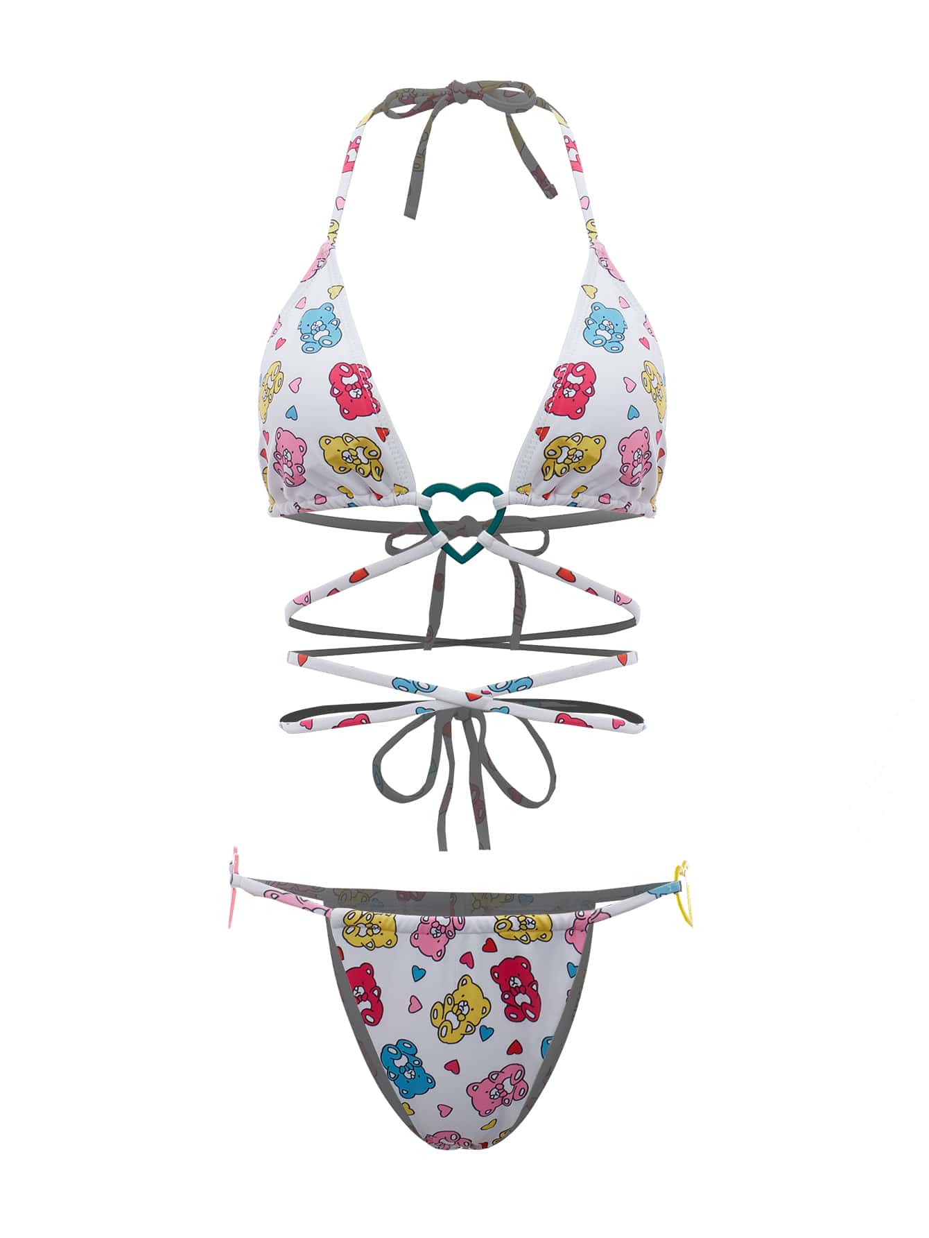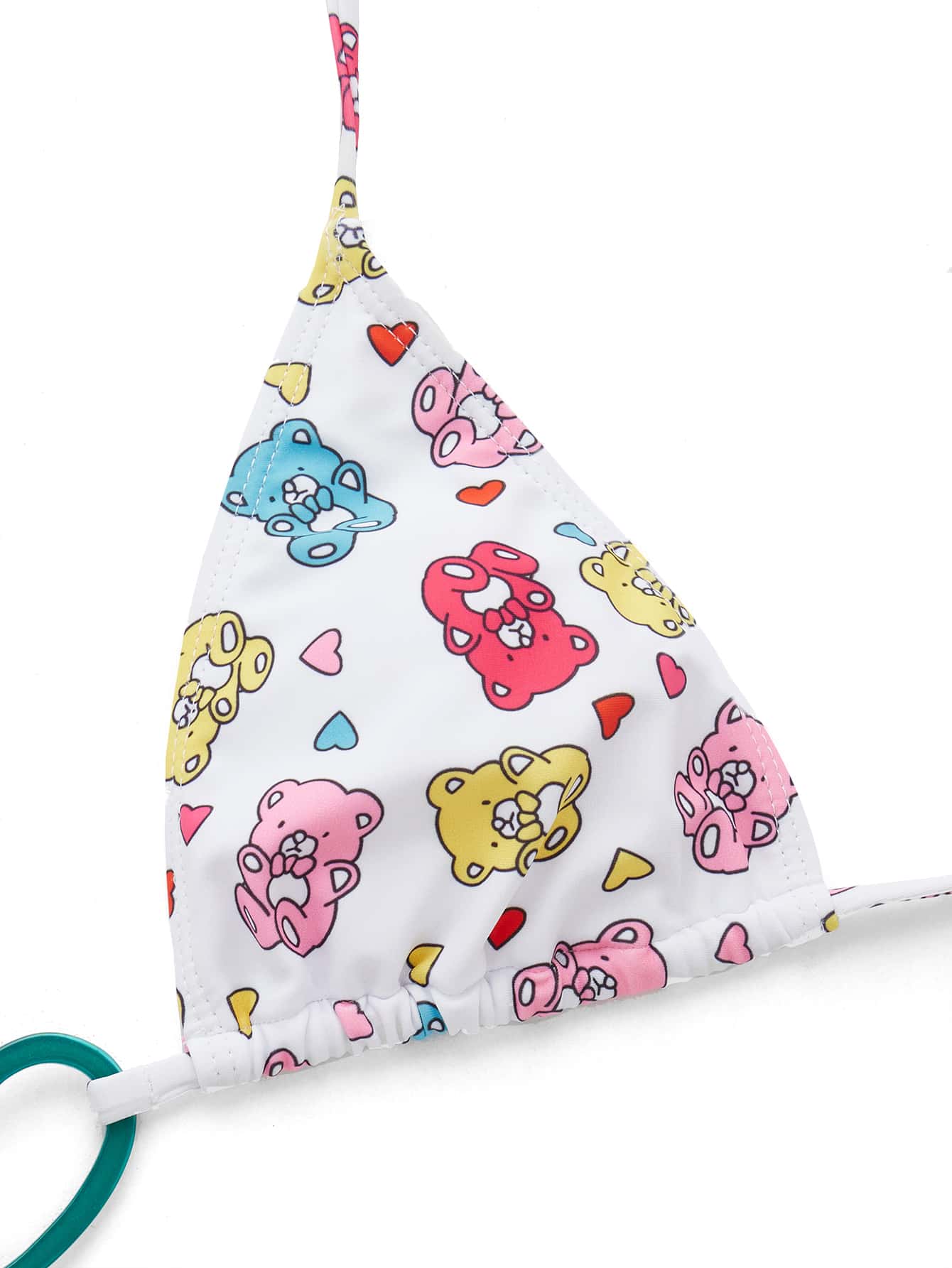 Sweetness Set bikini estivo con stampa orso cartone animato interconnessi a forma di cuore e incrociati sul collo
