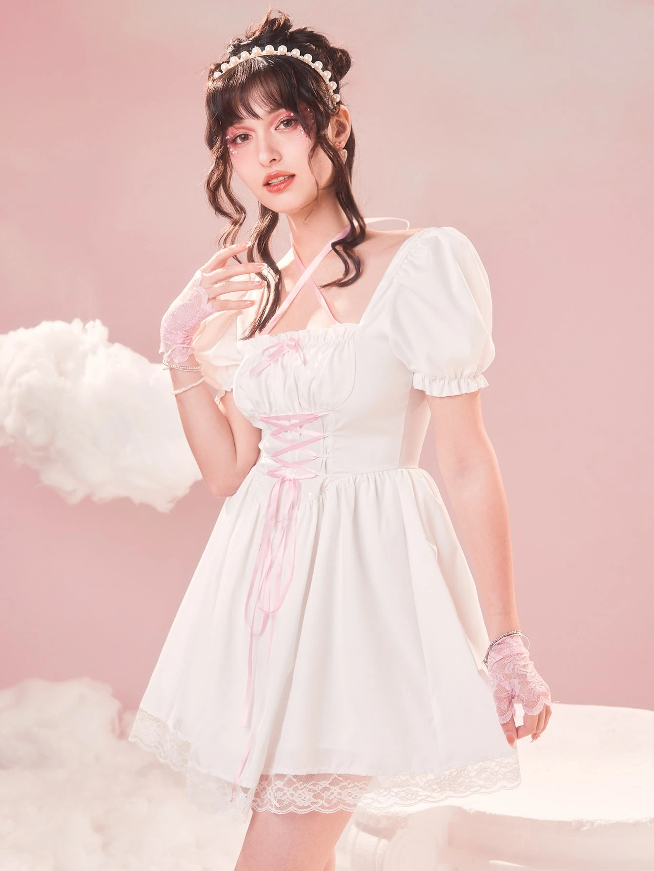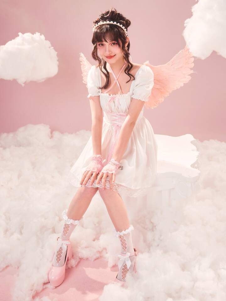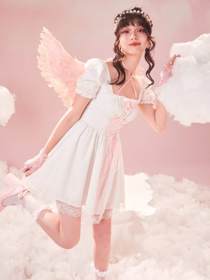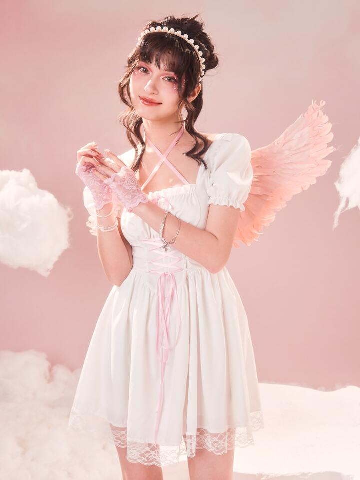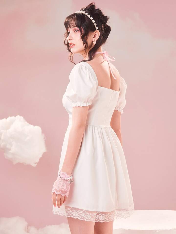 Sweetness Abiti con lacci pizzo a contrasto con manica a sbuffo