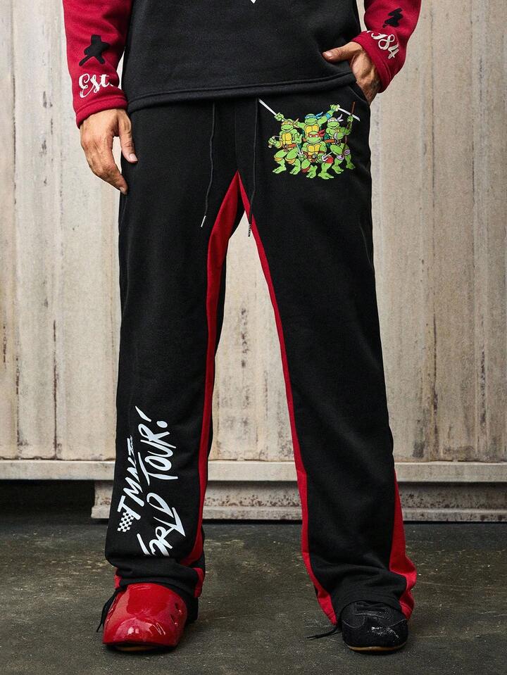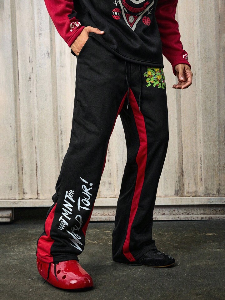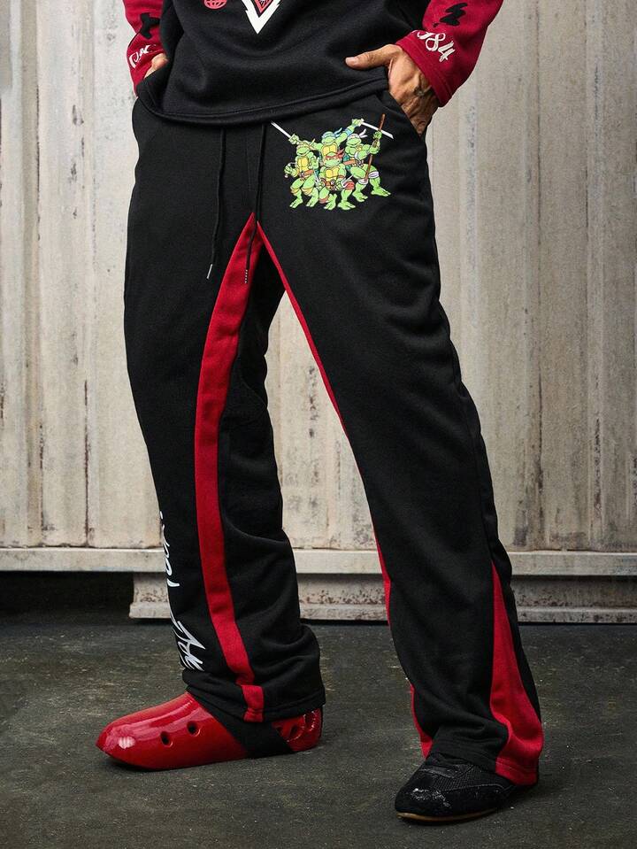 TEENAGE MUTANT NINJA TURTLES X ROMWE Pantaloni casual comodi da uomo con fondo a zampa, nero e rosso, adatti per l'autunno/inverno
