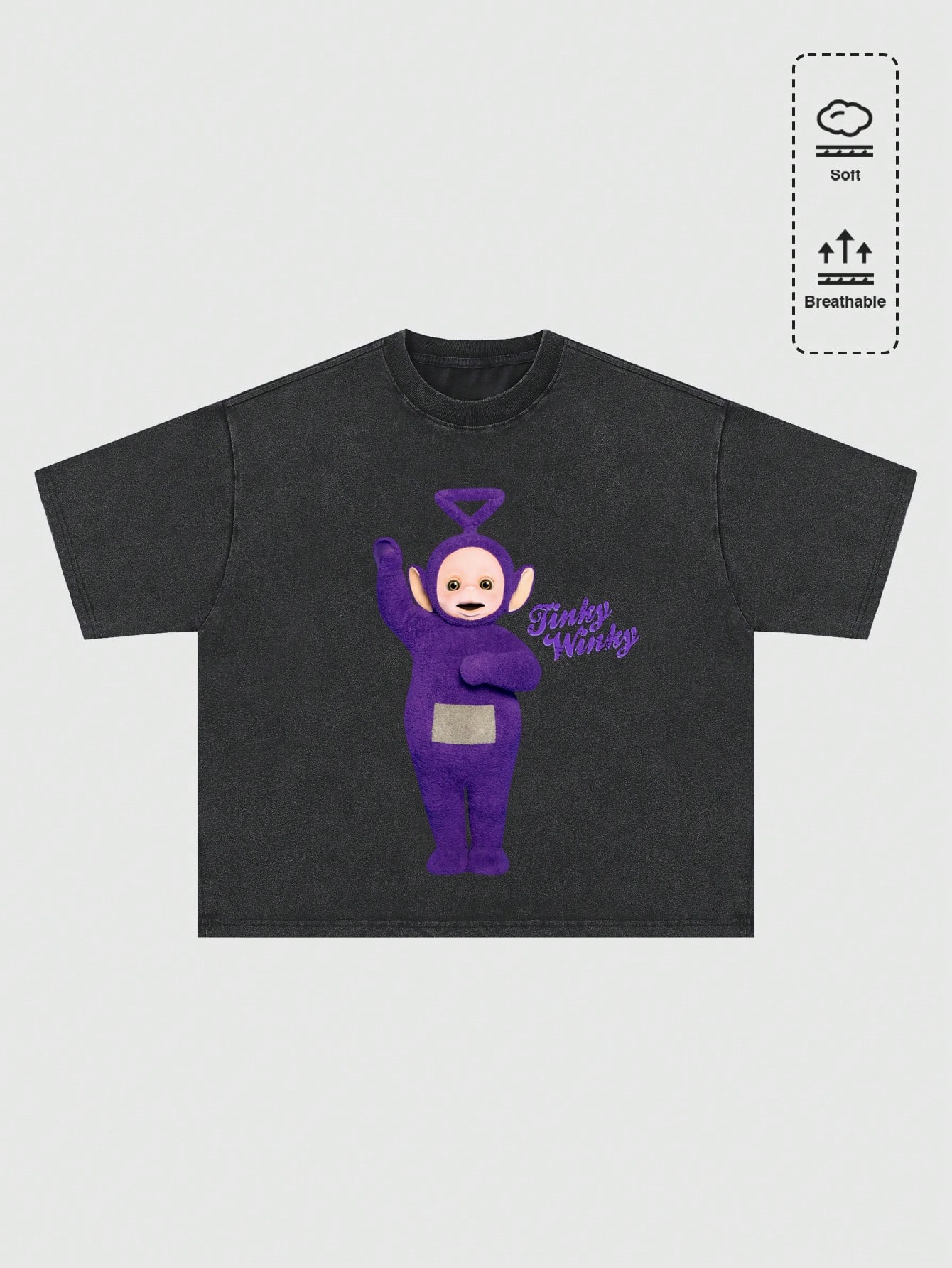 Teletubbies X ROMWE Maglietta a maniche corte con grafica a cartone animato lavata, vestibilità ampia per uomo