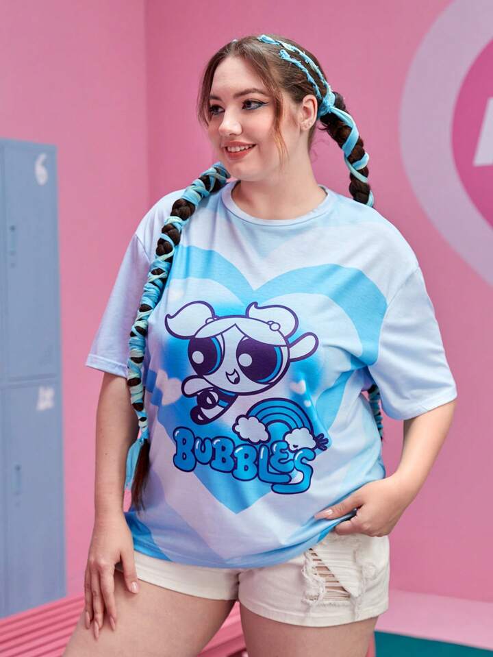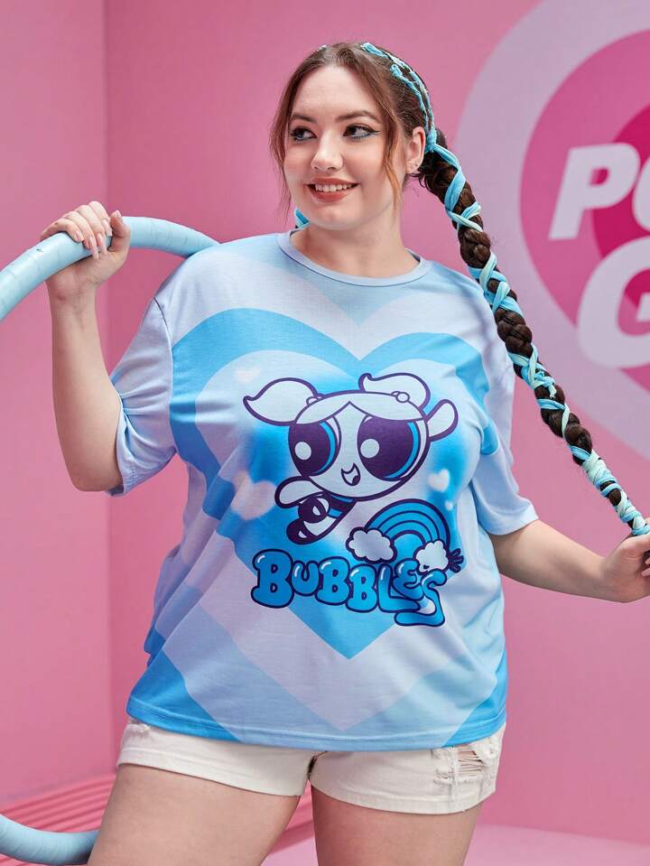 The Powerpuff Girls | ROMWE Taglie Forti Maglietta con spalla cadenti cuore con grafica di cartoni e lettere