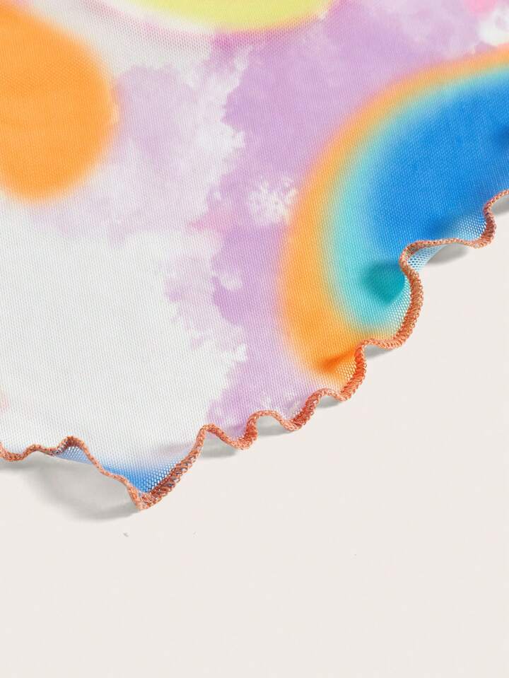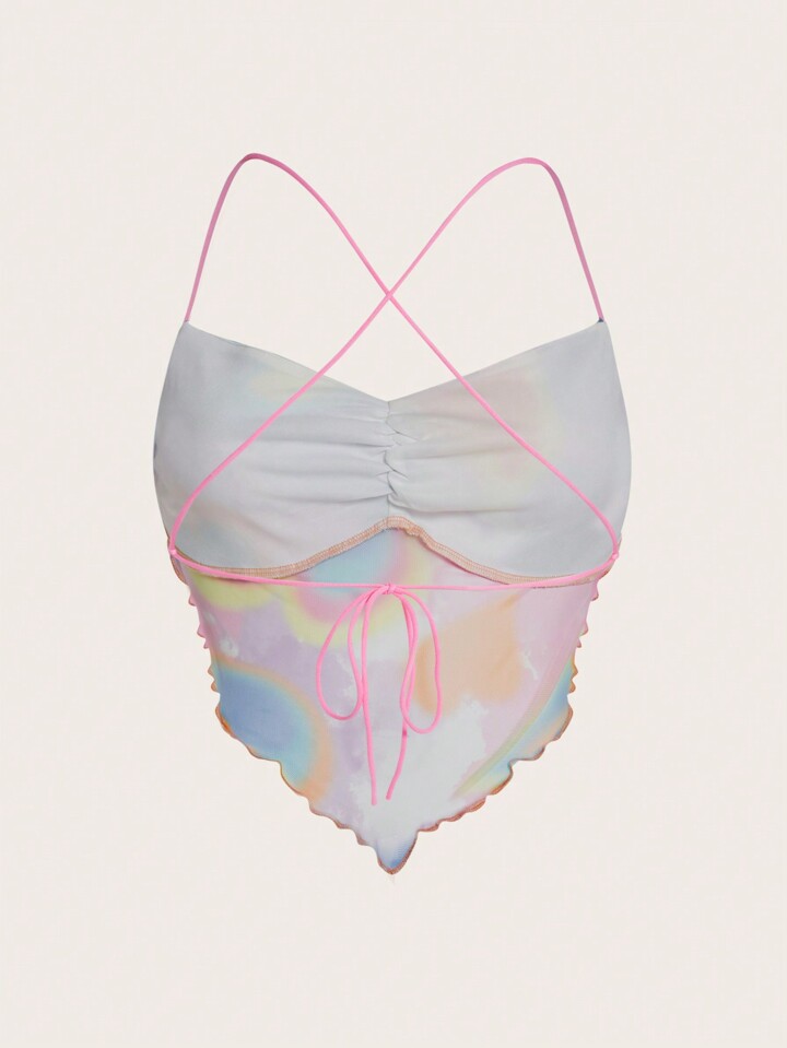 Top con bretelle sottile tie dye e con stampa cuore orlo lattuga mesh