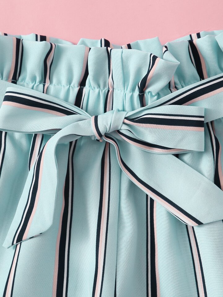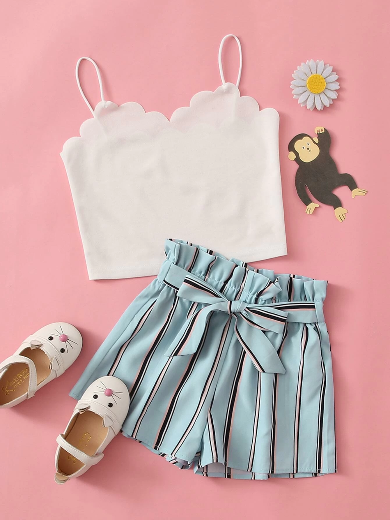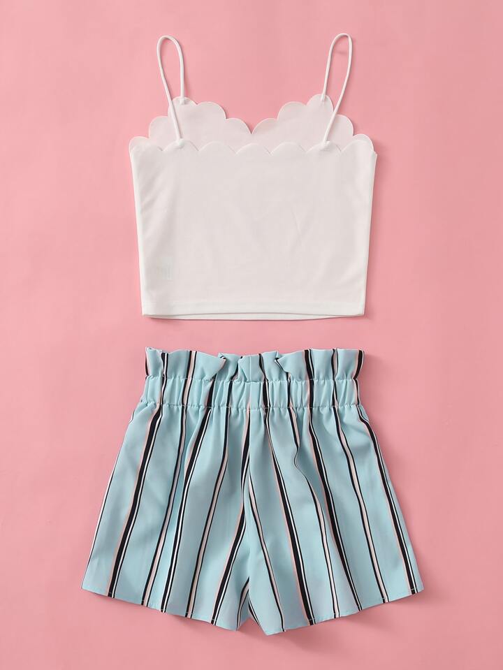 Set top con bretelle e orlo a smerlo e Shorts con cinture e vita a volant sovrapposti da ragazza