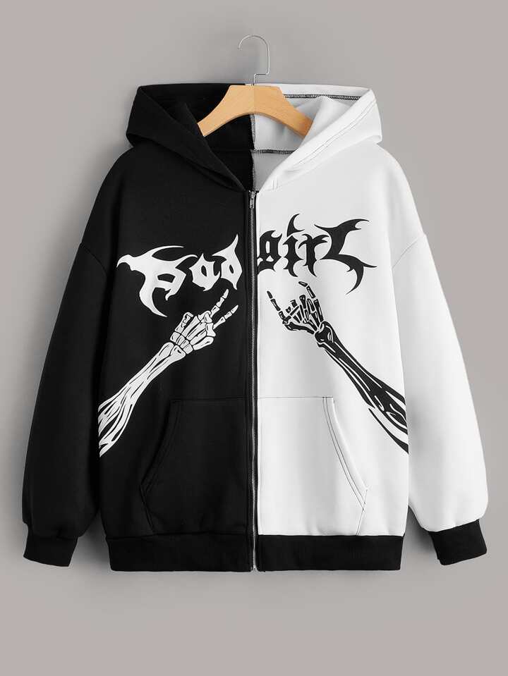 Felpa termica con cappuccio bicolore con stampa scheletri con zip