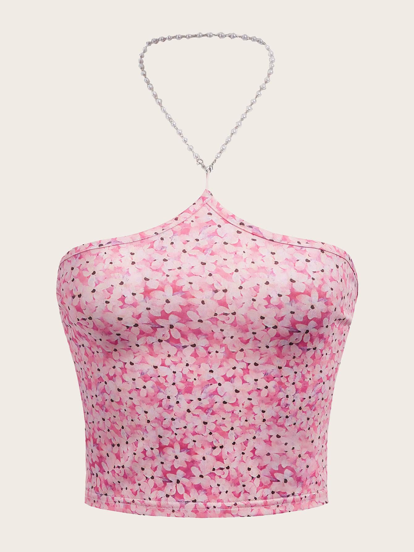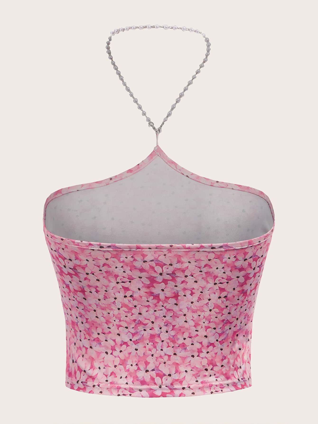 Blusa da vacanza con scollo a V, decorazione a catena e stampa floreale ditsy