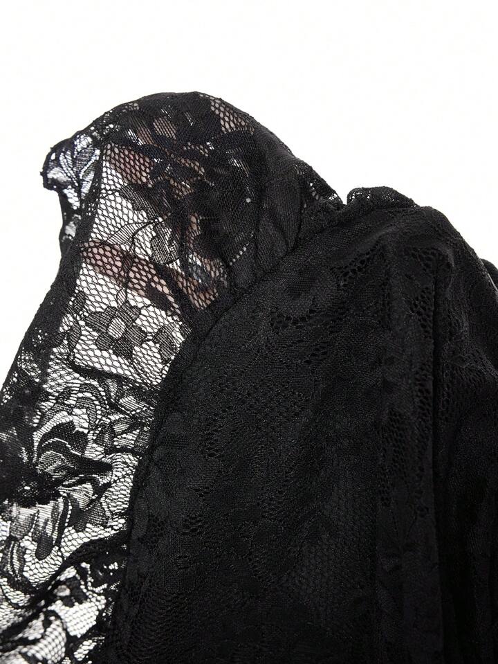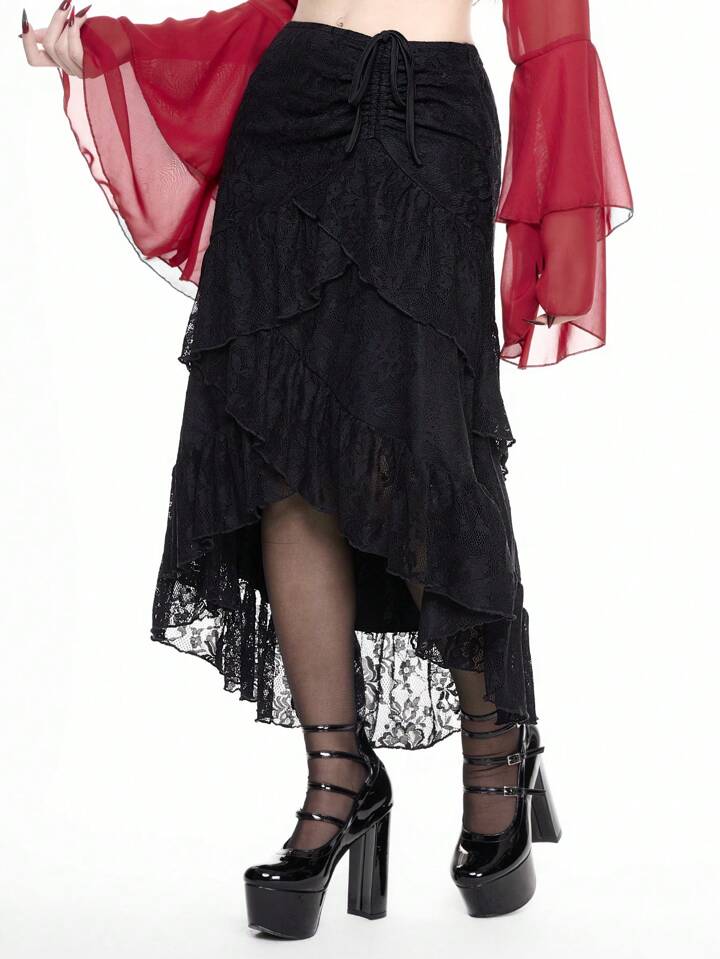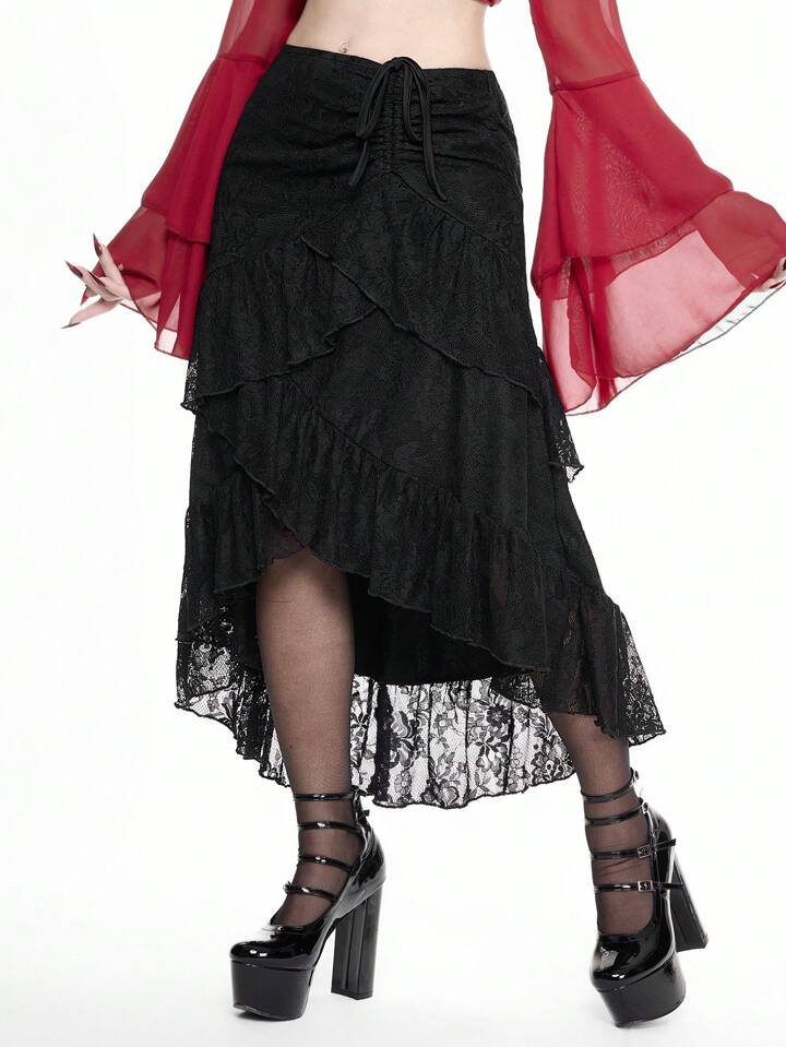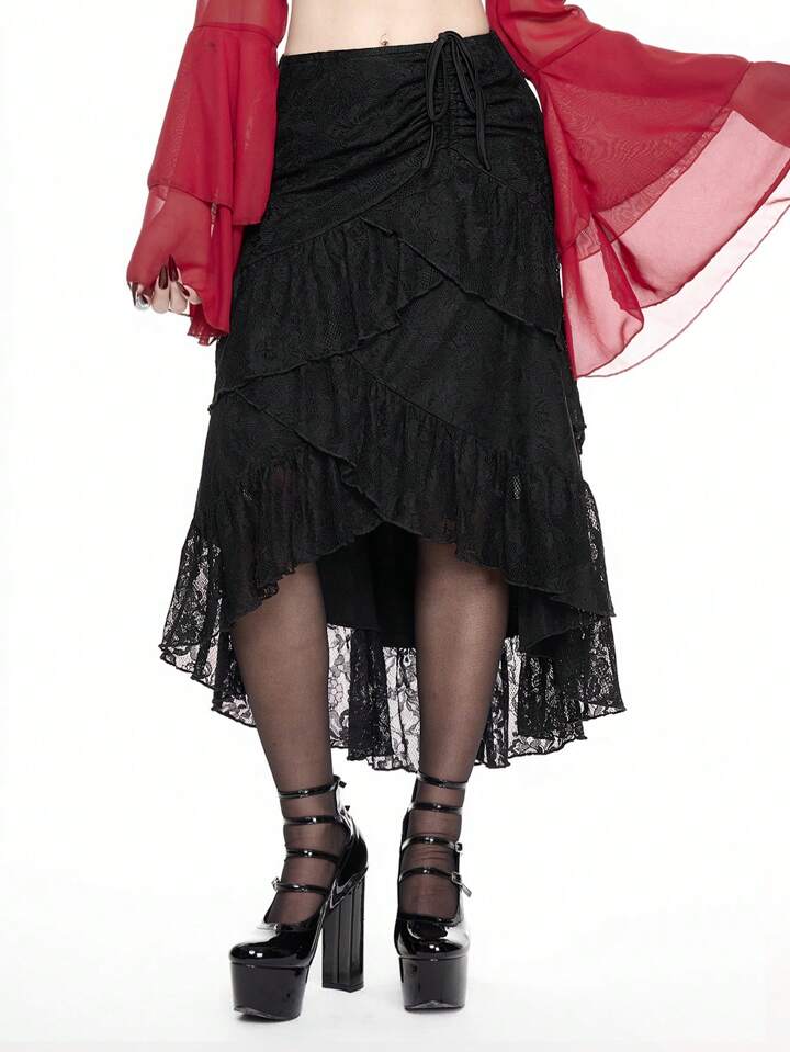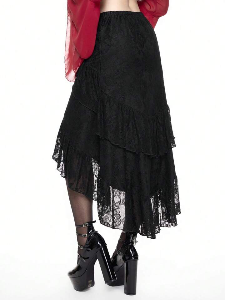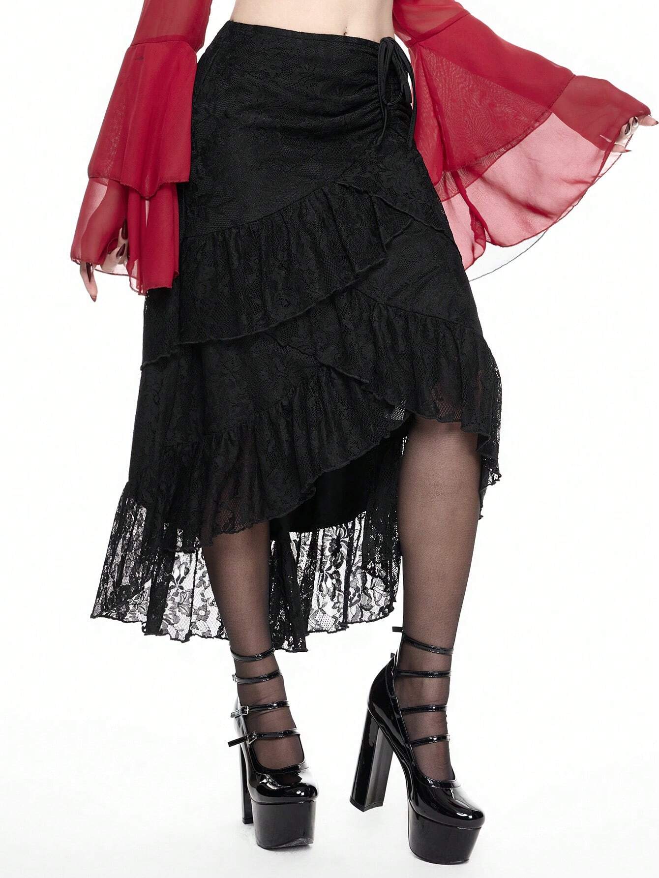 Gonna nera a balze per il giorno di San Valentino, gonna da donna con vita arricciata e volant in pizzo, ideale per outfit estivi, gonna da donna