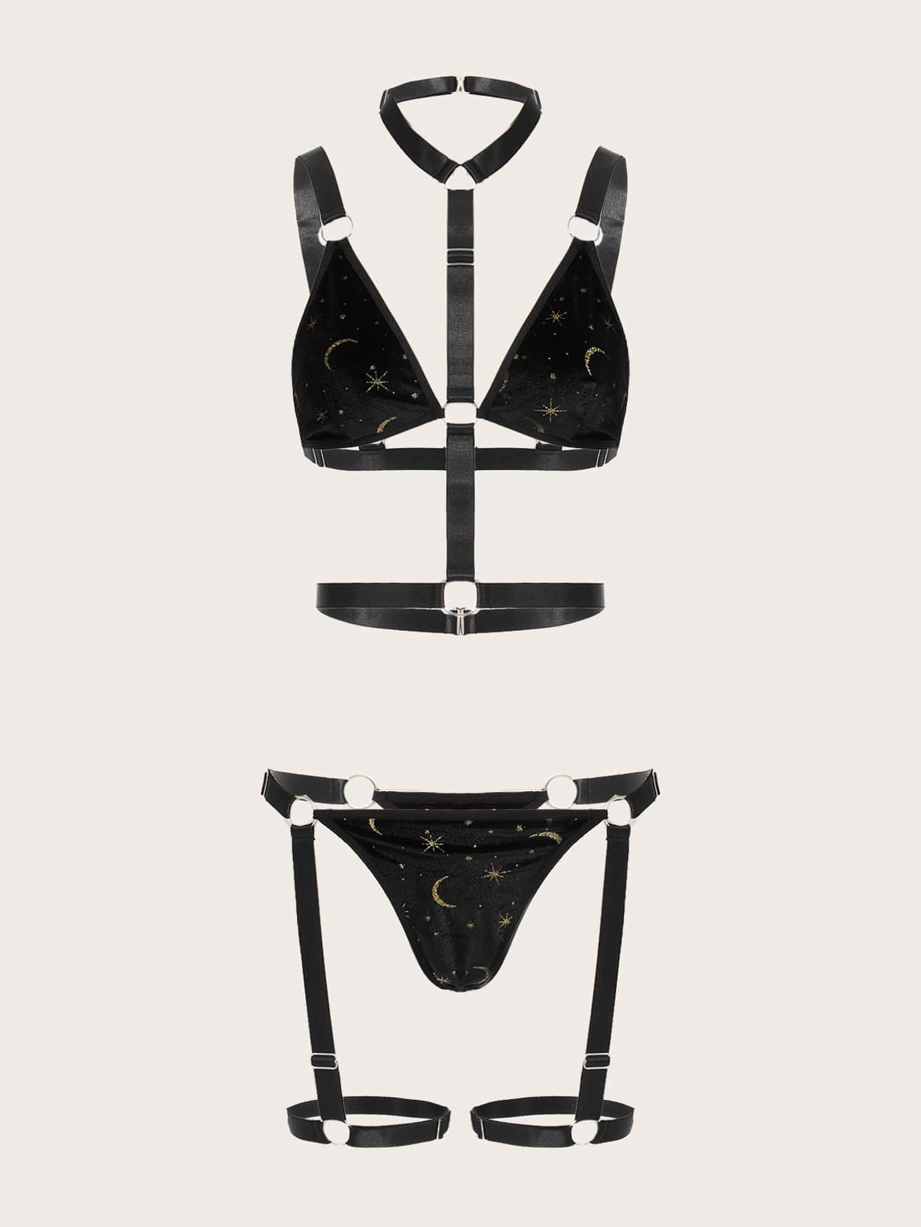 Set lingerie di velluto luna & motivo galassia anello collegato Giarrettiera