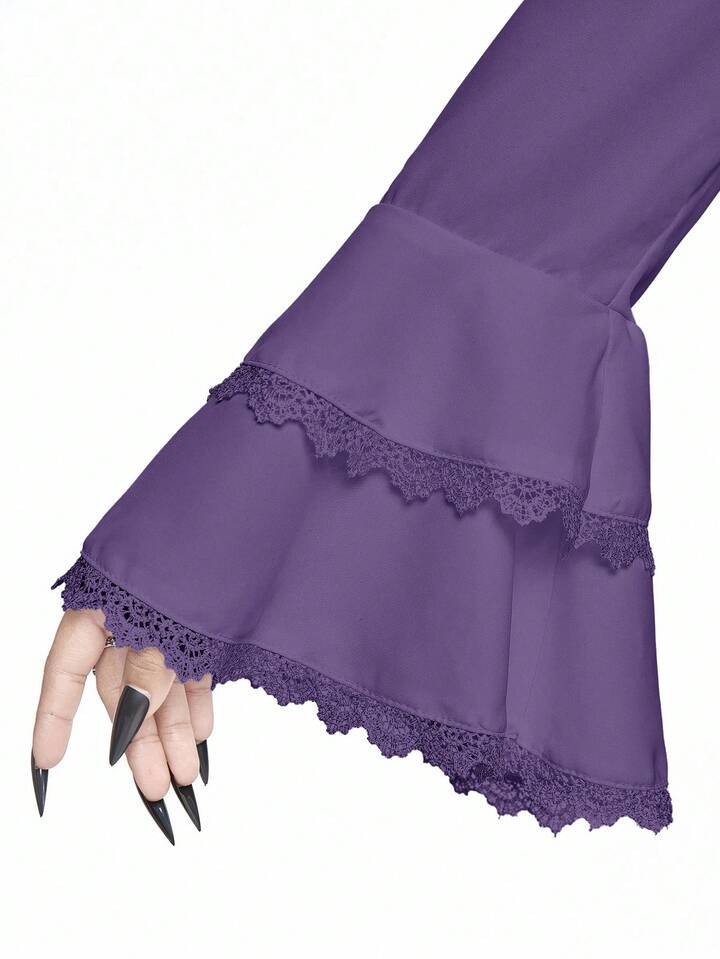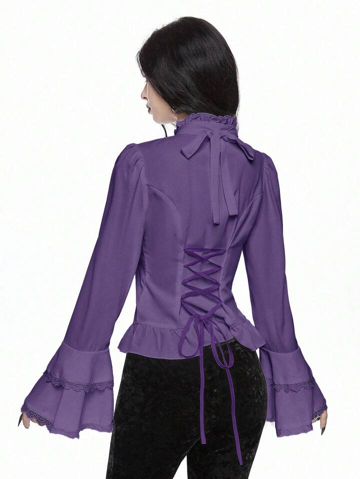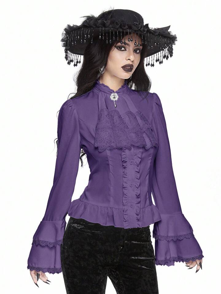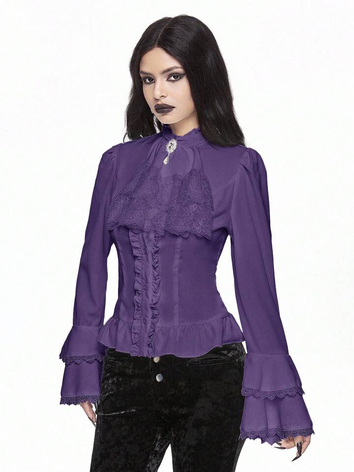 Goth Blusa da donna in stile gotico vintage con colletto staccabile a volant, pendente barocco in cristallo, maniche a sbuffo con volant, vita segnata