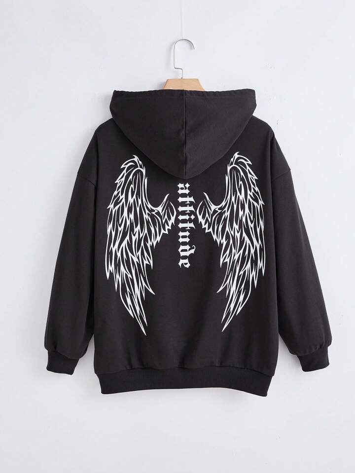 Felpa con cappuccio con grafica ali e lettere con zip spalle cadenti senza reggiseno