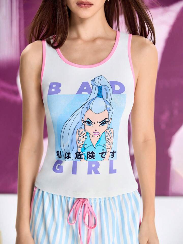 Winx Club X ROMWE Set di pigiama costituito da canotta con grafica a figura dei cartoni animati e lettera e pantaloncini a righe
