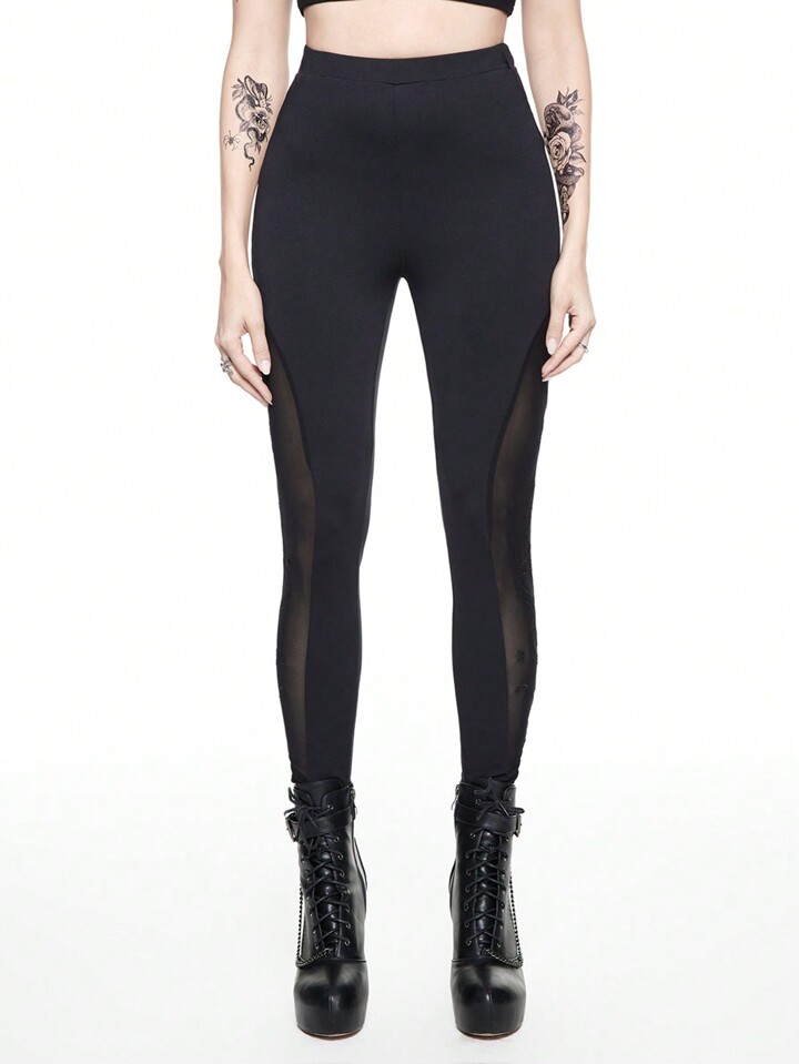 Goth Leggings da donna in stile gotico, con motivo in pelle di serpente scuro, effetto patchwork, ricamo botanico