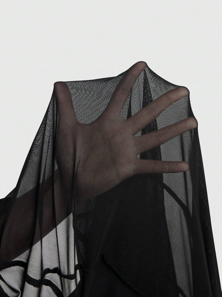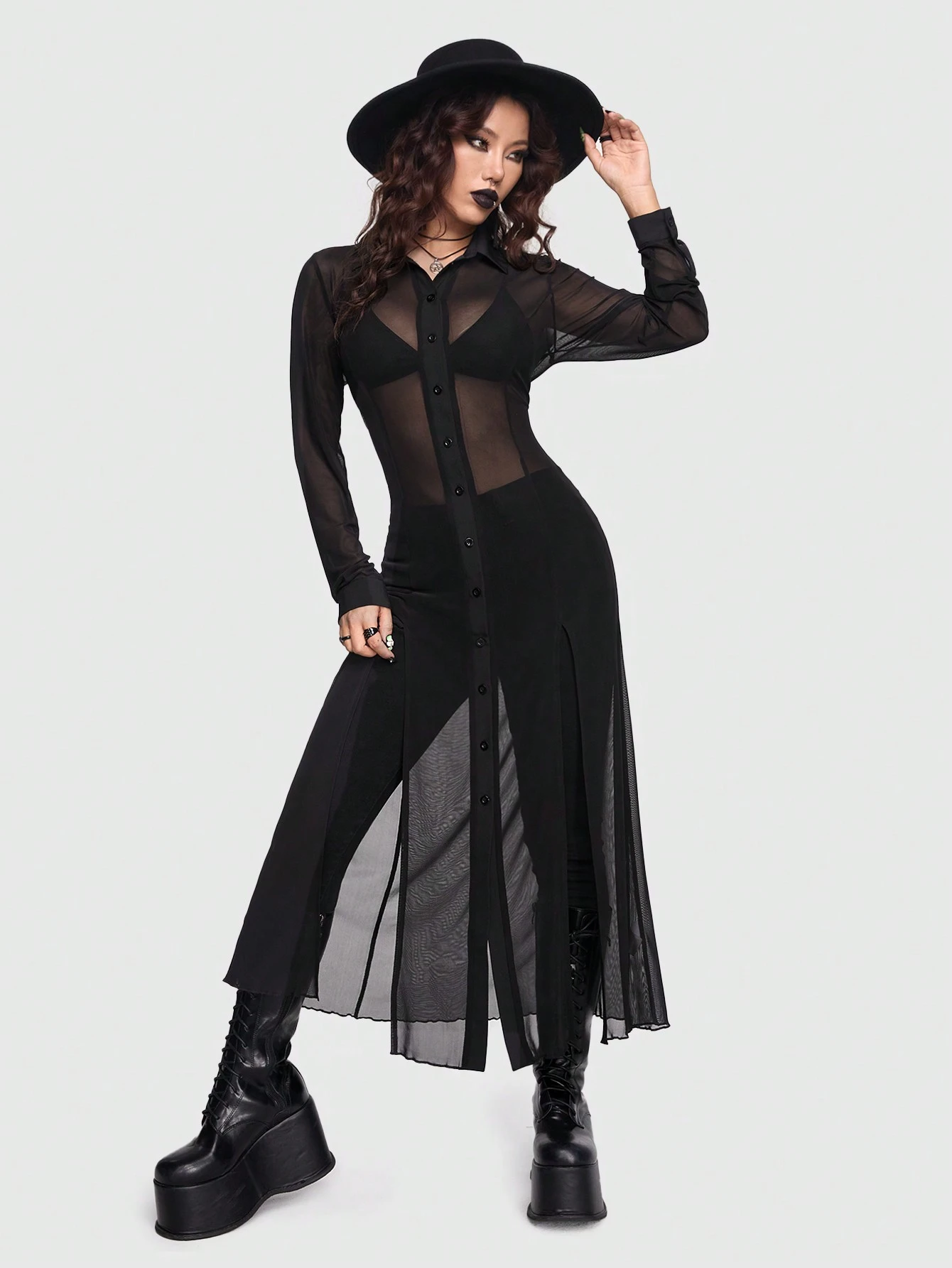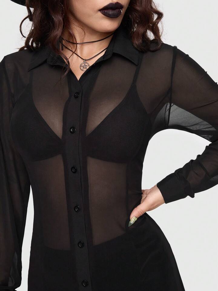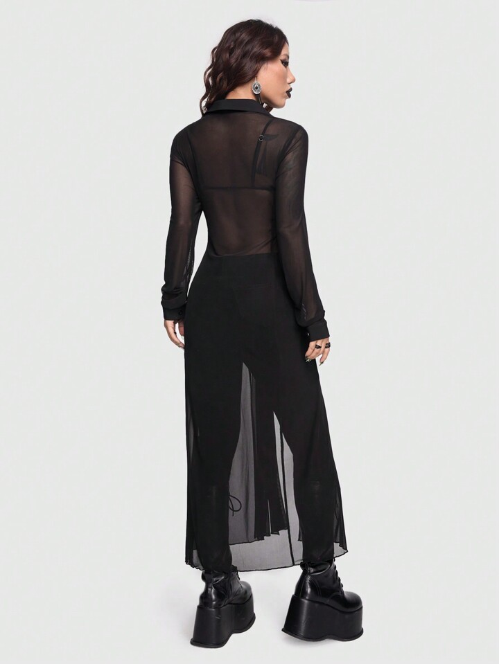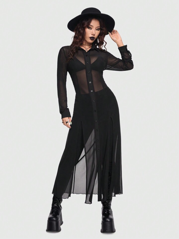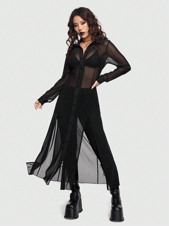 Goth Camicia Lunga Trasparente Gotica Sexy E Misteriosa Da Donna Con Design A Spacco Alto, Taglio Dritto E Stretto, Colore Scuro