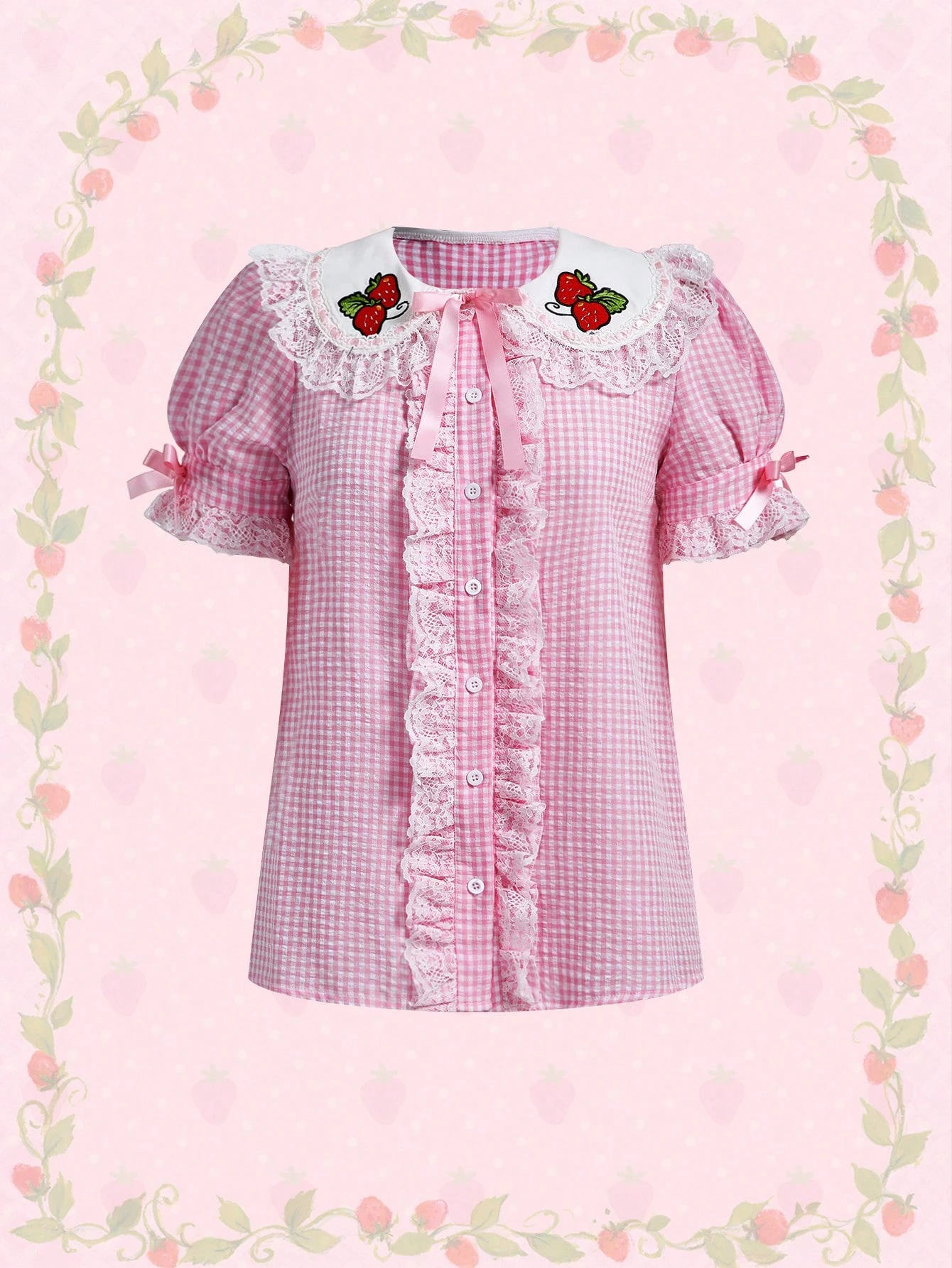 Camicia da donna con colletto Peter Pan, ricamo a fragola, stampa a quadri Gingham, maniche a sbuffo
