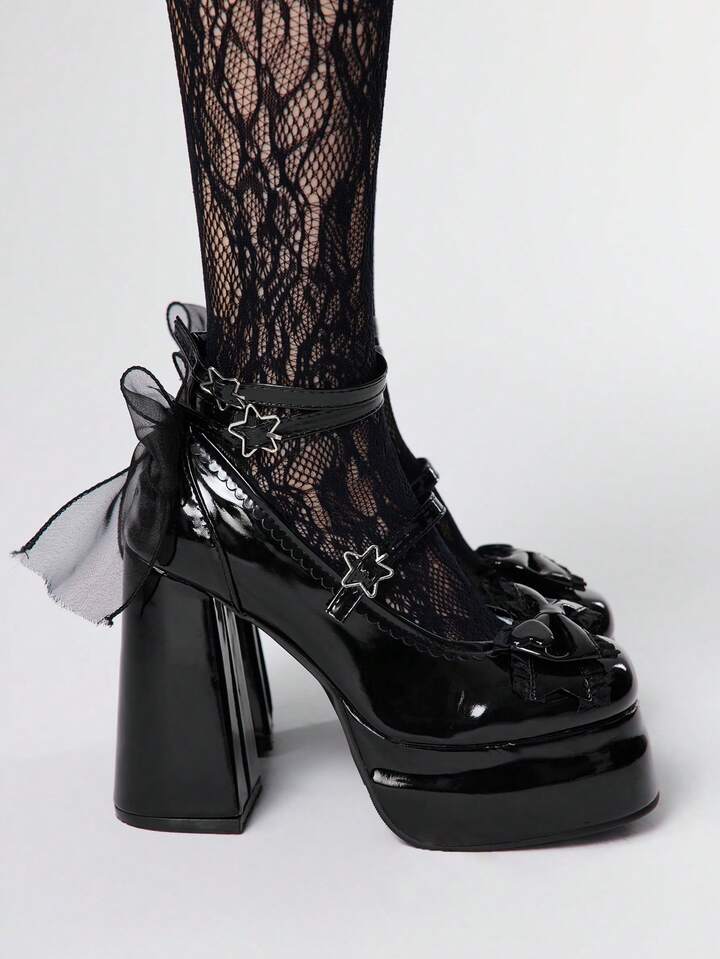 Scarpe Mary Jane con tacco alto e punta chiusa da donna, nere, con cinturino, piattaforma impermeabile, stile Lolita gotico con fiocco, pumps stile JK dolce