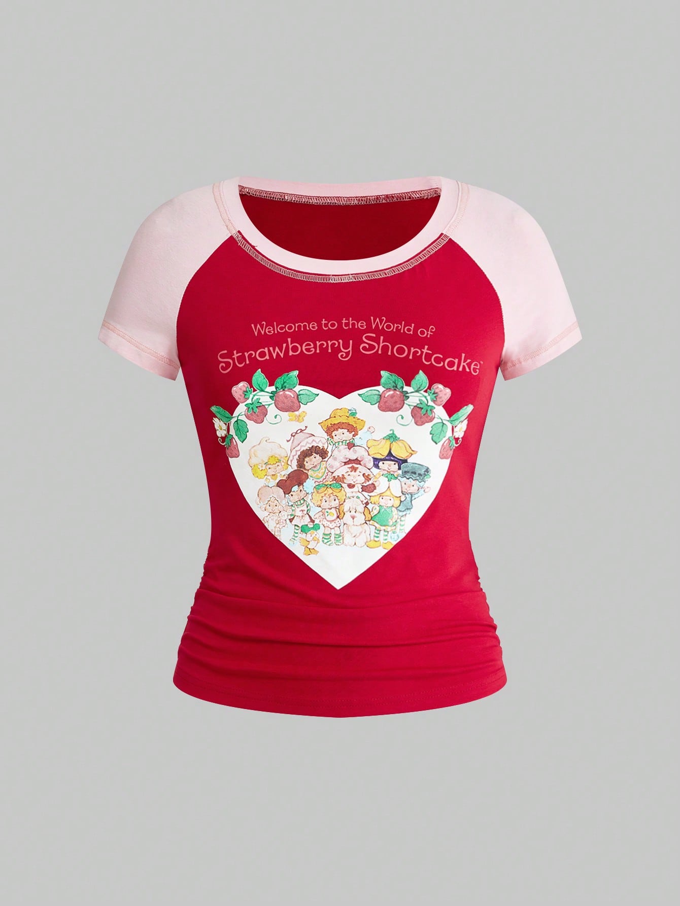 maglietta estiva casual da donna per vacanze e pendolarismo, con grafica a contrasto di figure cartoni animati e slogan con fragola