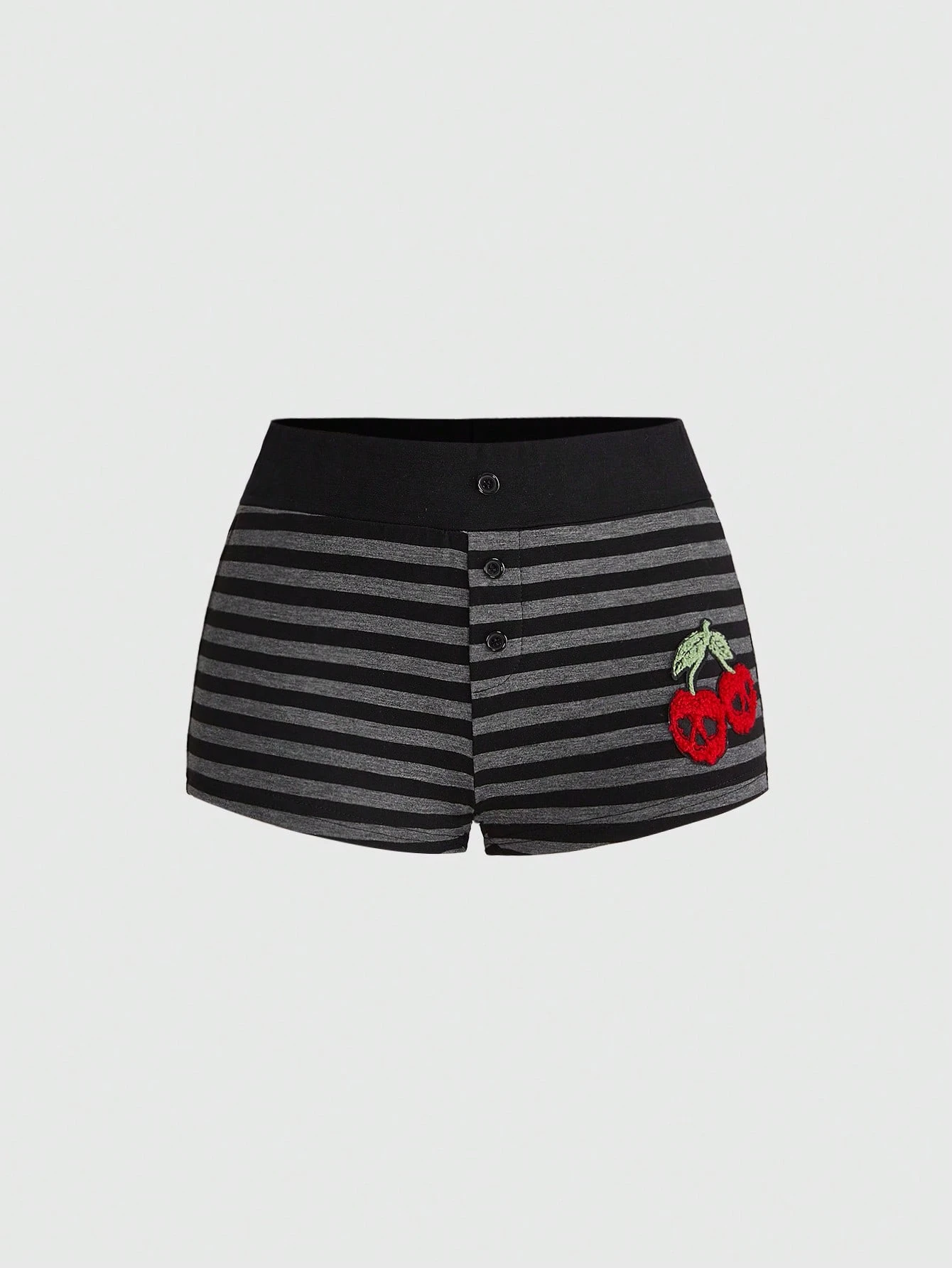 Goth Pantaloncini da donna in stile gotico scuro, a righe nere e grigie, con teschio e ricamo di ciliegie