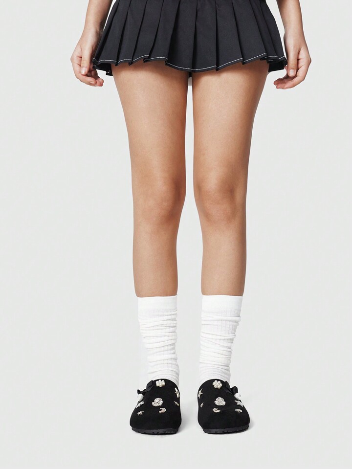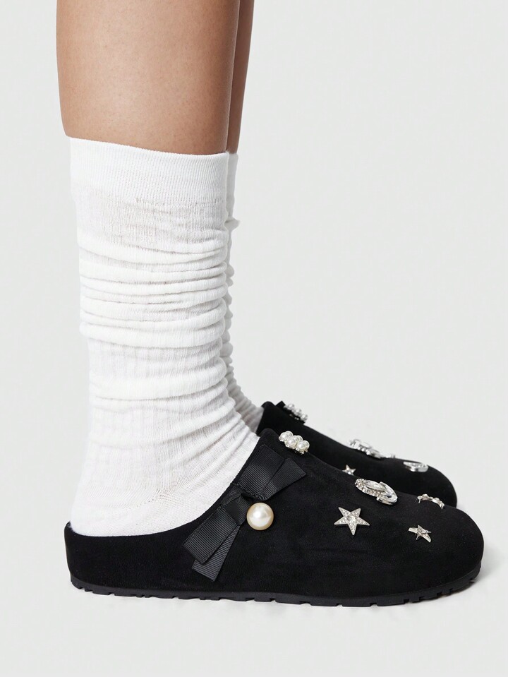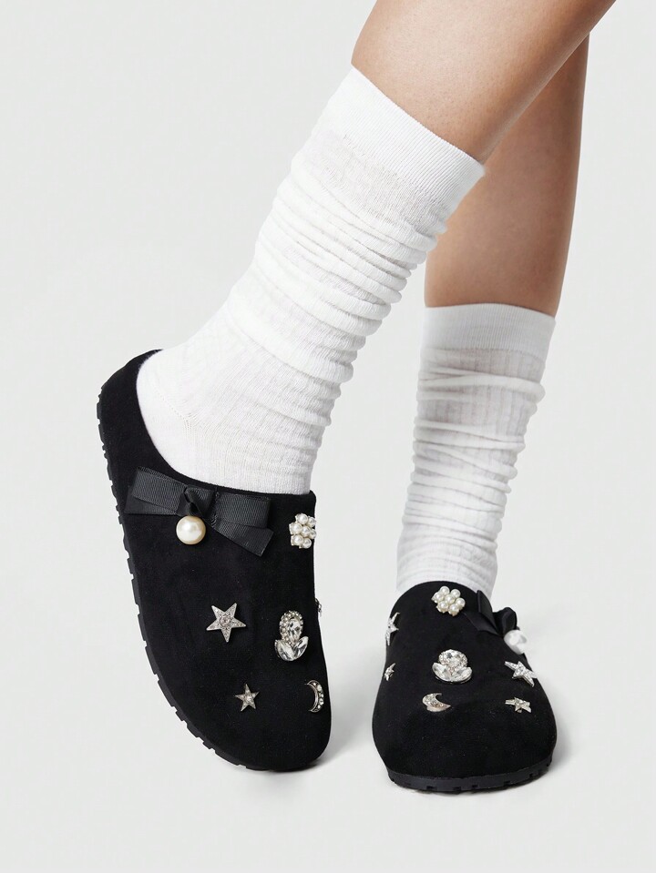 Goth Scarpe gotiche scure e punk da donna, mule con punta chiusa e tallone scoperto, mocassini con punta chiusa, decorati con stelle e glitter, con fiocco e perle, scarpe piatte con suola spessa e stile gotico, slip-on