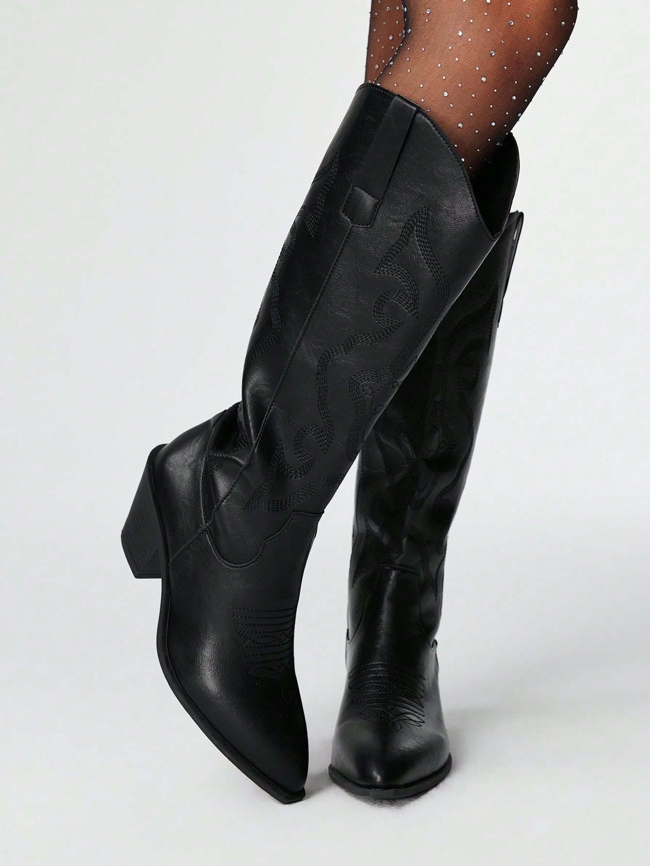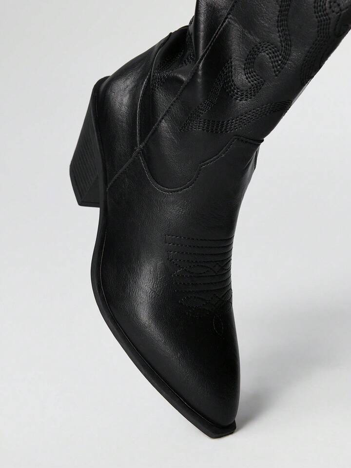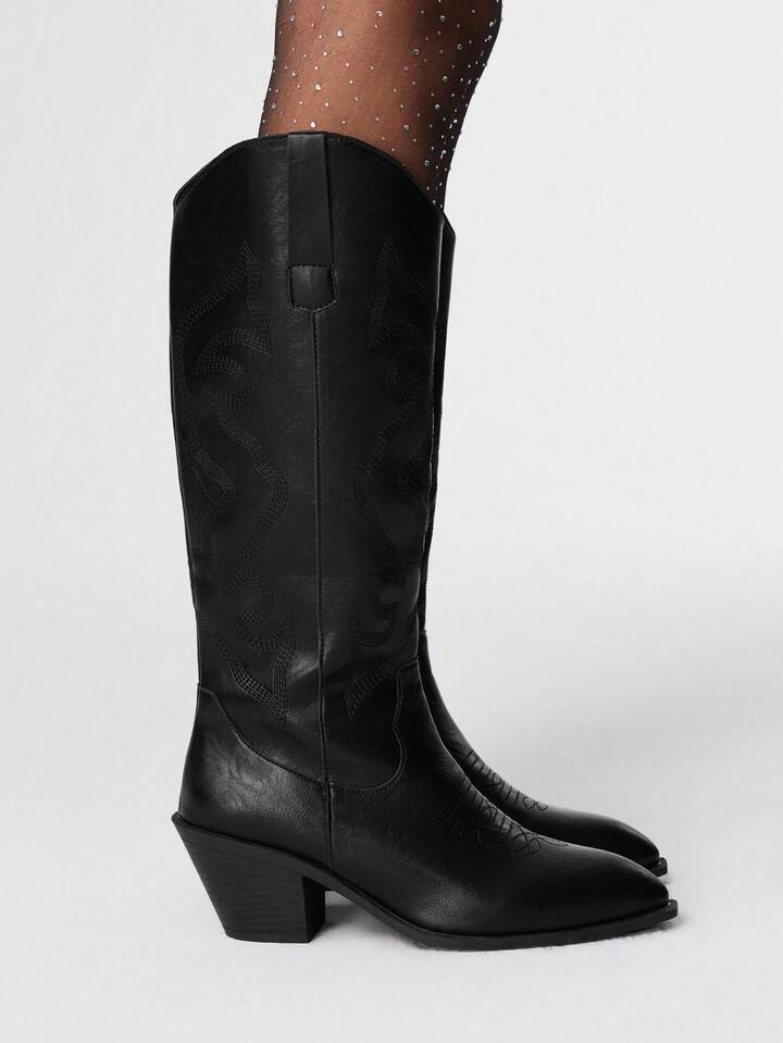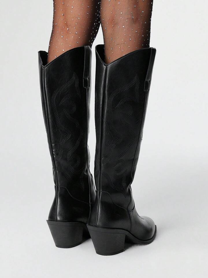 Goth Stivali gotici scuri da donna, stivali lunghi western neri con ricamo a V, stivali in pelle con tacco basso e gambale alto