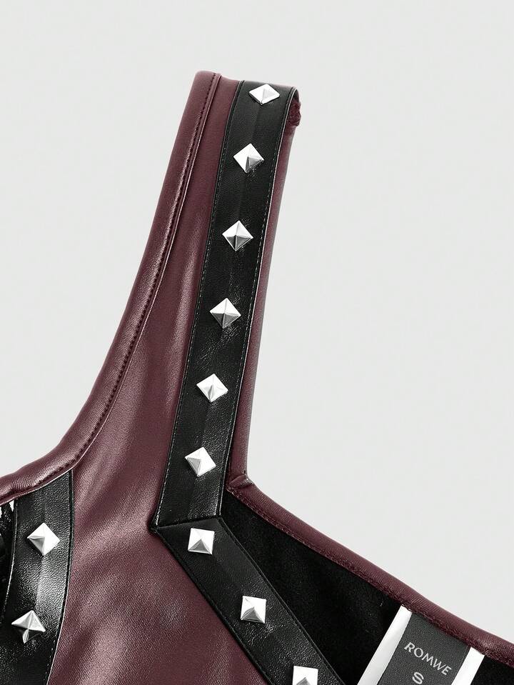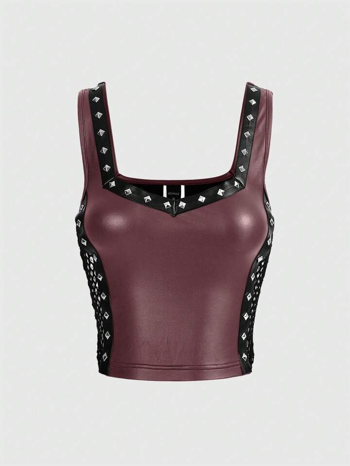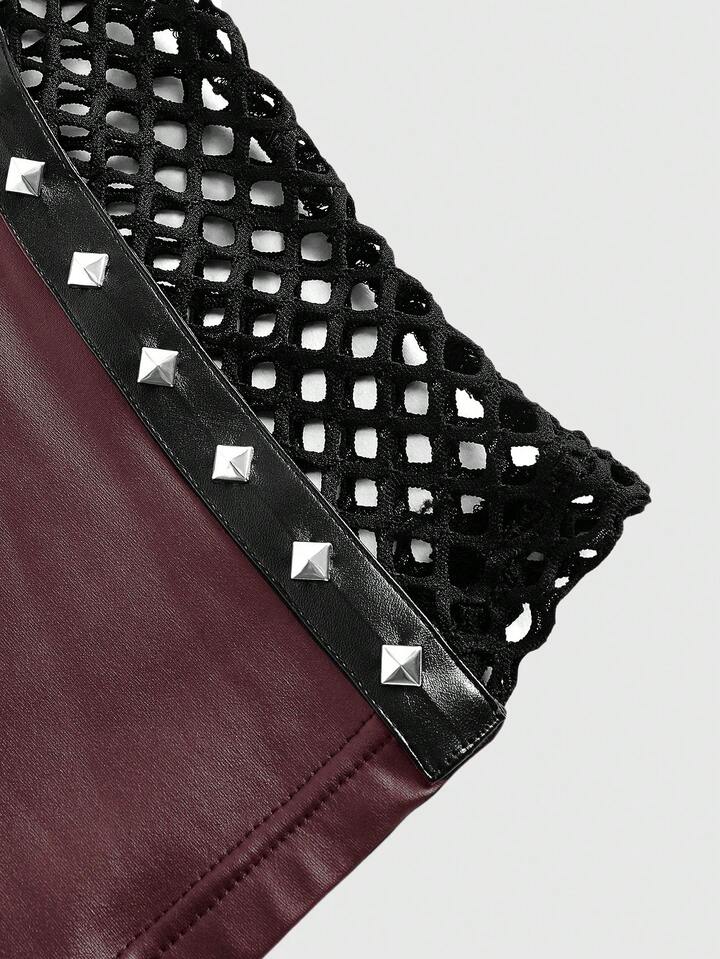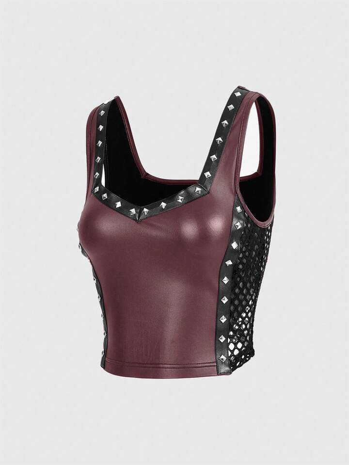 Top da donna in stile punk di strada, in pelle sintetica PU, con decorazione di borchie, rete laterale e design traforato