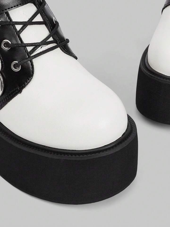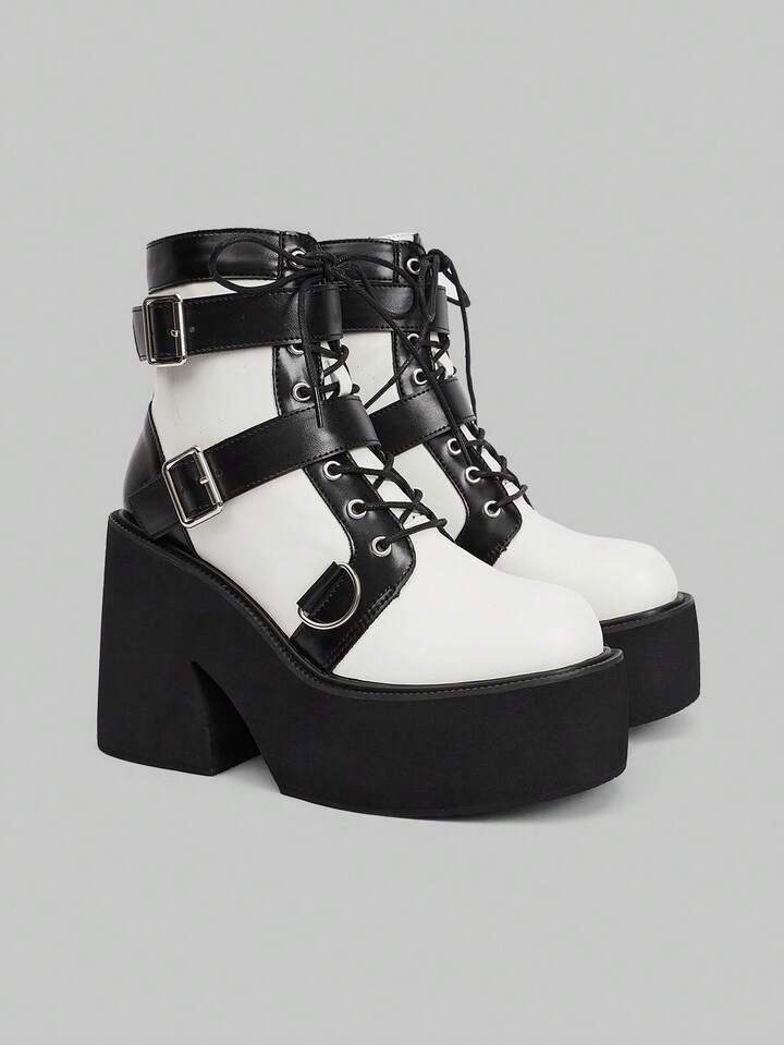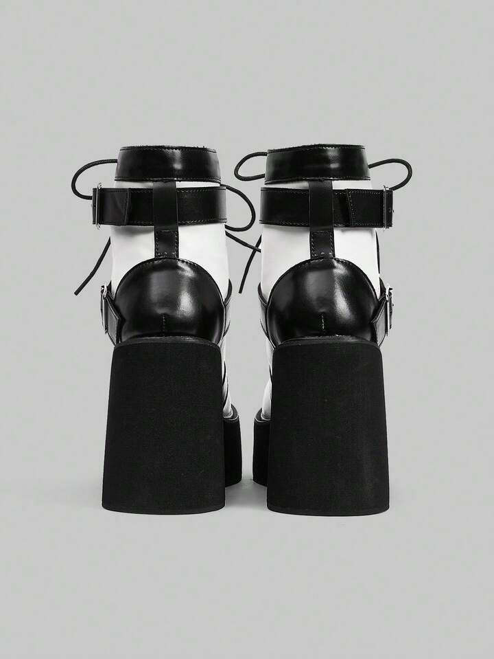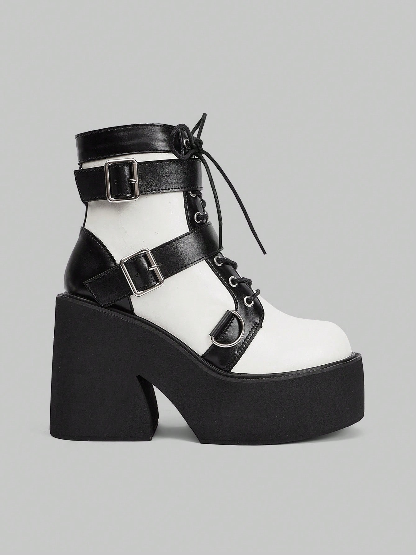 Stivali da donna con suola spessa - Stivali alla caviglia casual neri con fibbia rotonda, doppia cinghia e tacco chunky - Comodi slip-on
