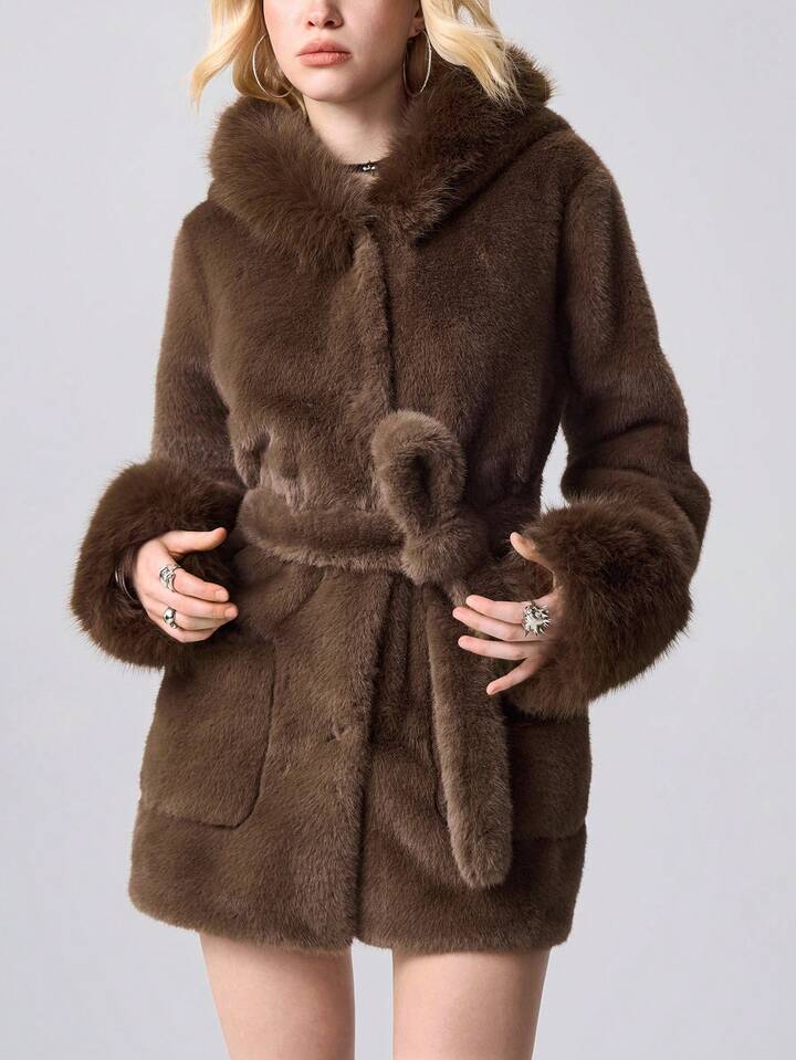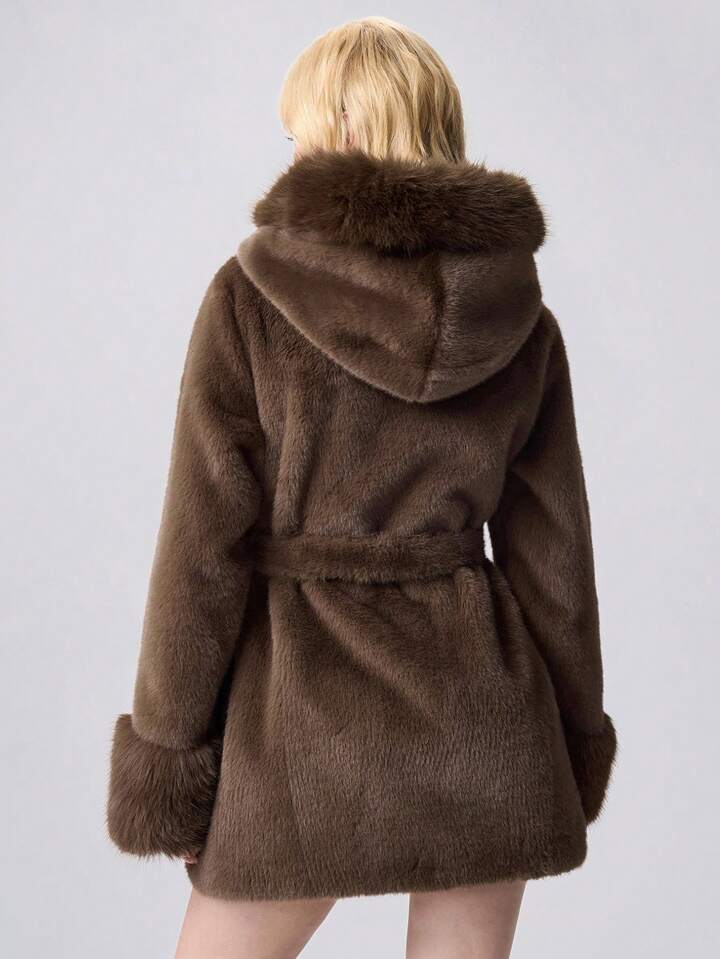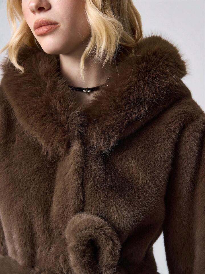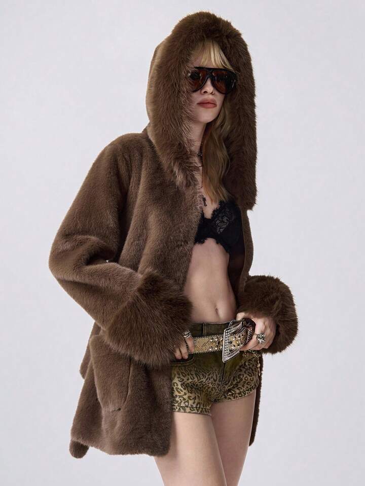 Giacca con cappuccio in pelliccia sintetica di moda, autunno/inverno per donna