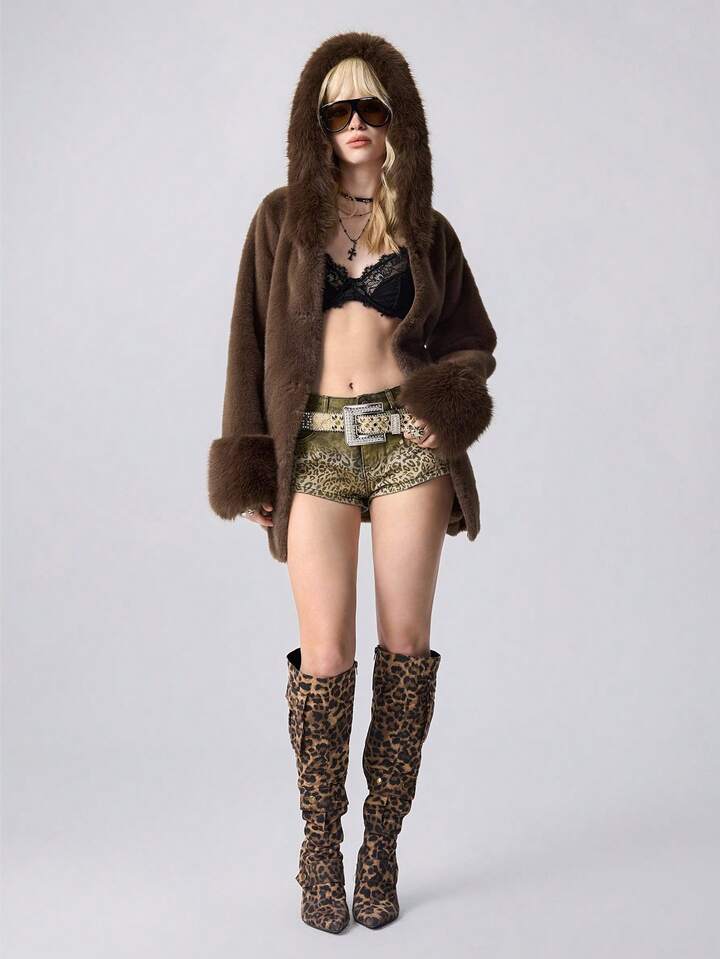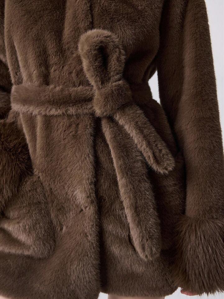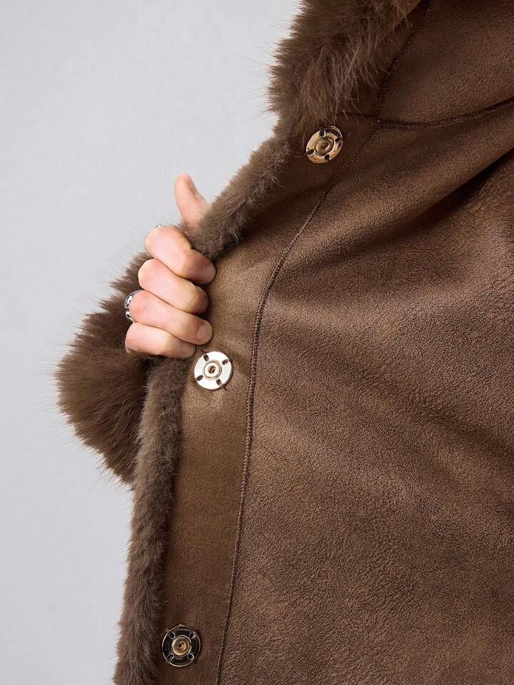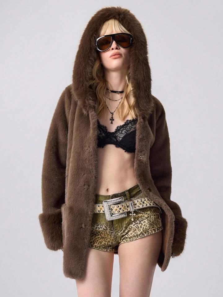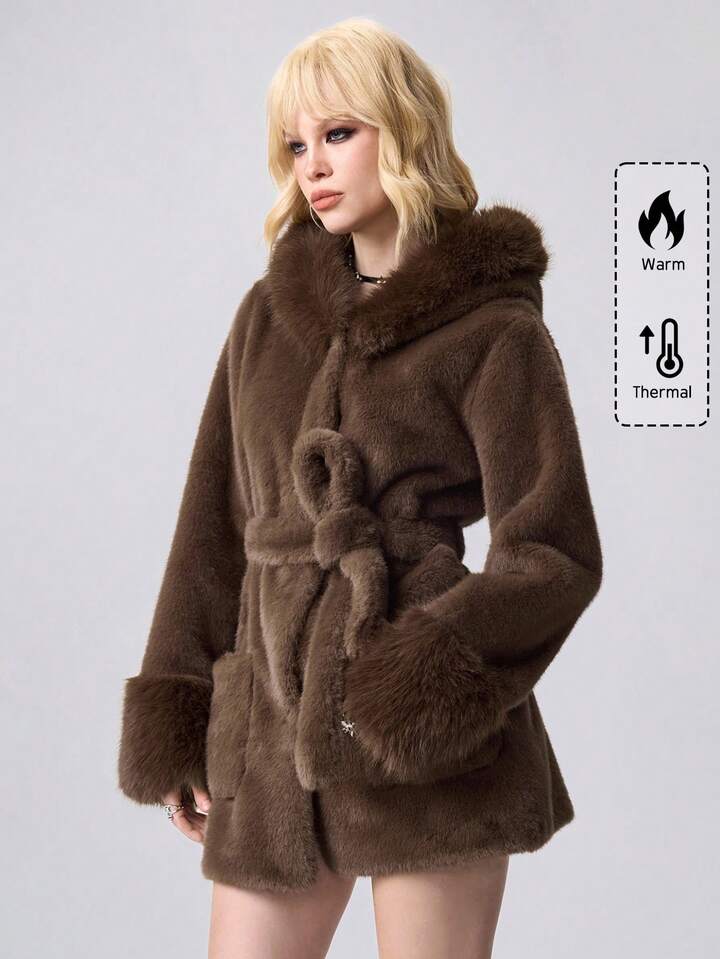 Giacca con cappuccio in pelliccia sintetica di moda, autunno/inverno per donna
