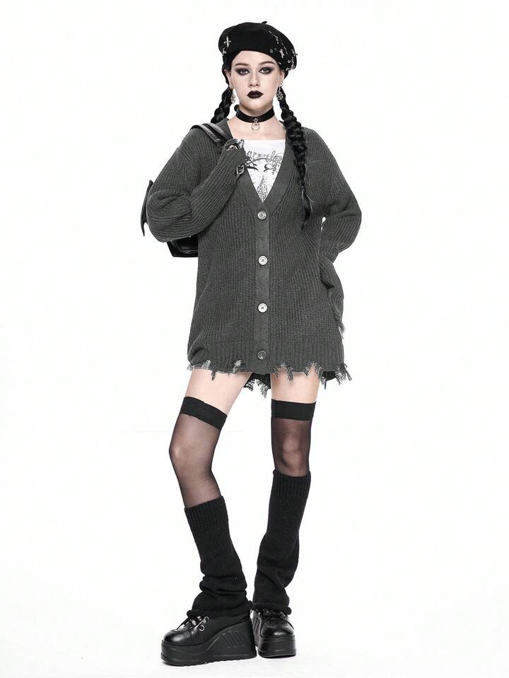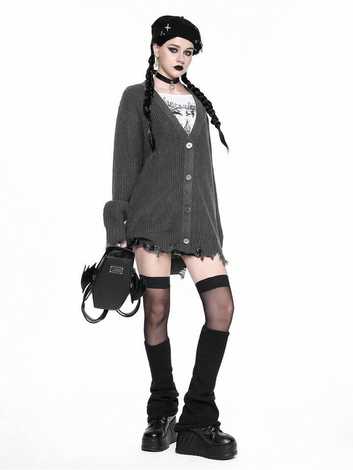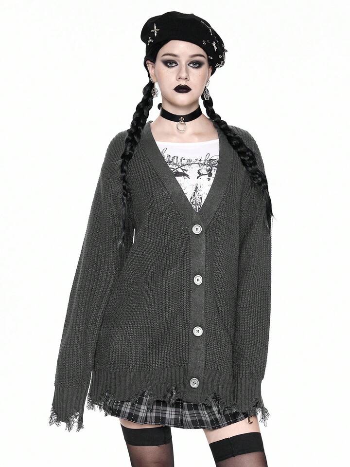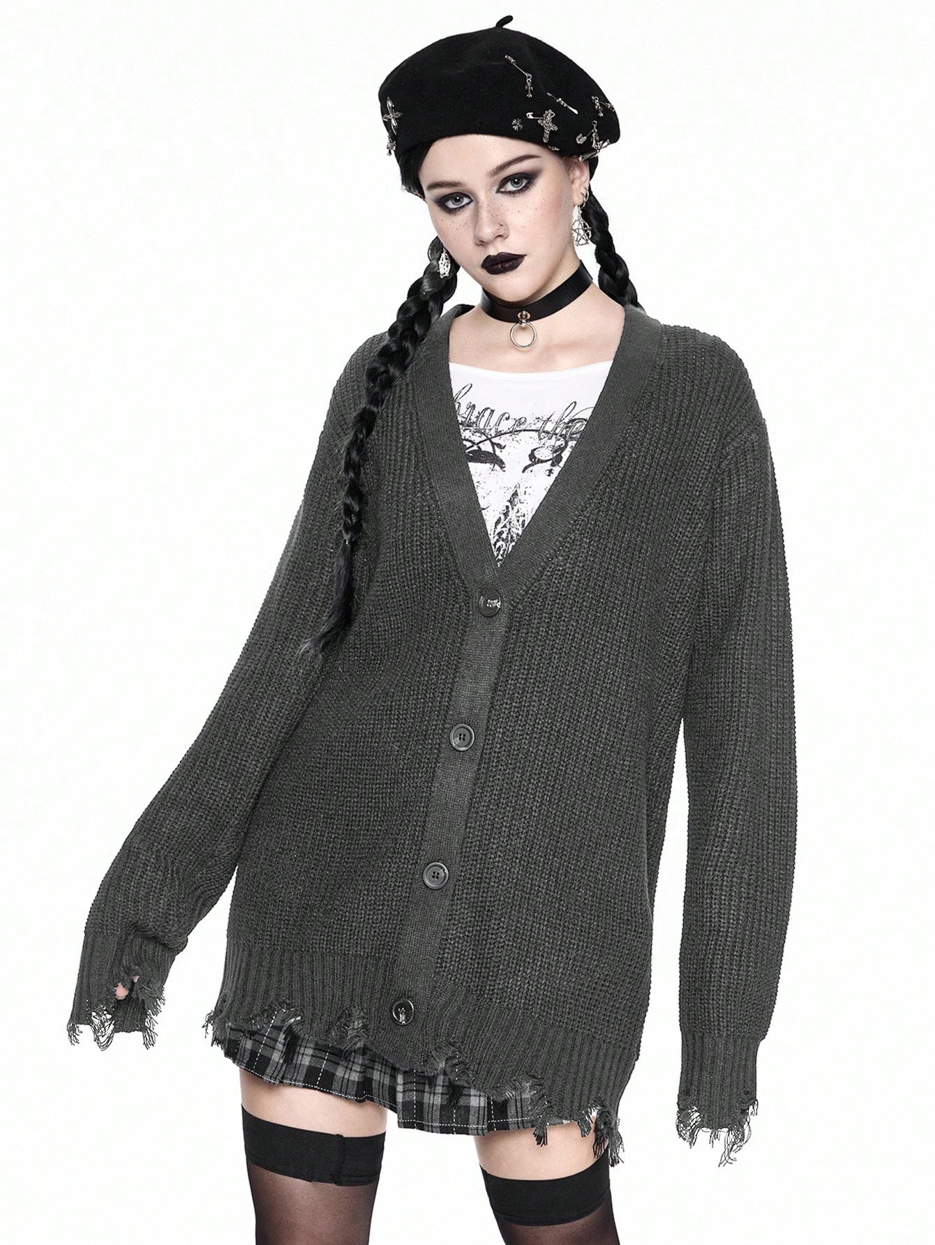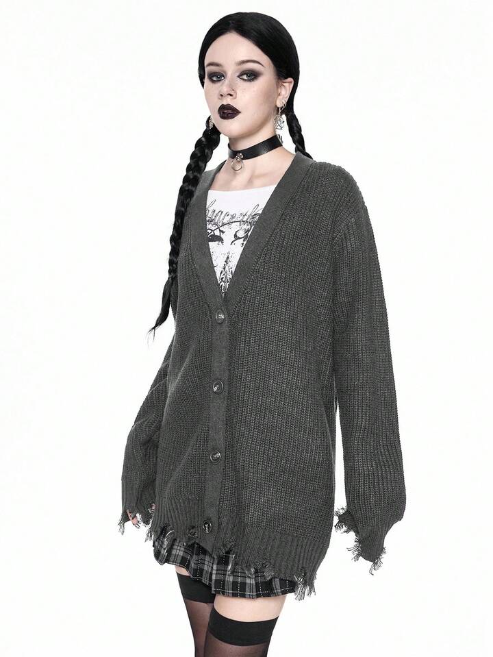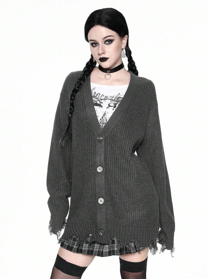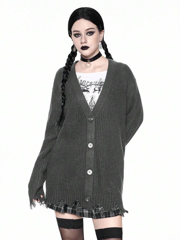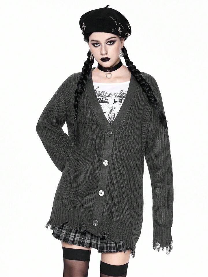 Goth Cardigan casual con scollo a V, orlo sfilacciato, maglia larga, stile gotico, adatto per autunno/inverno