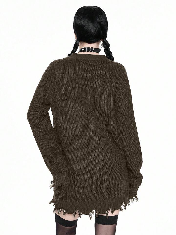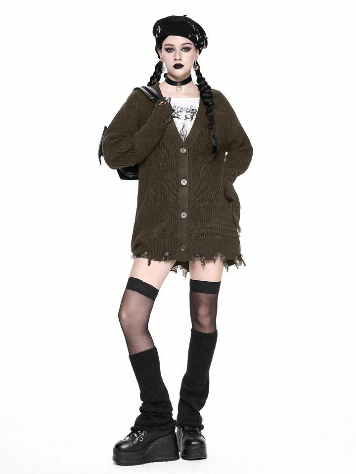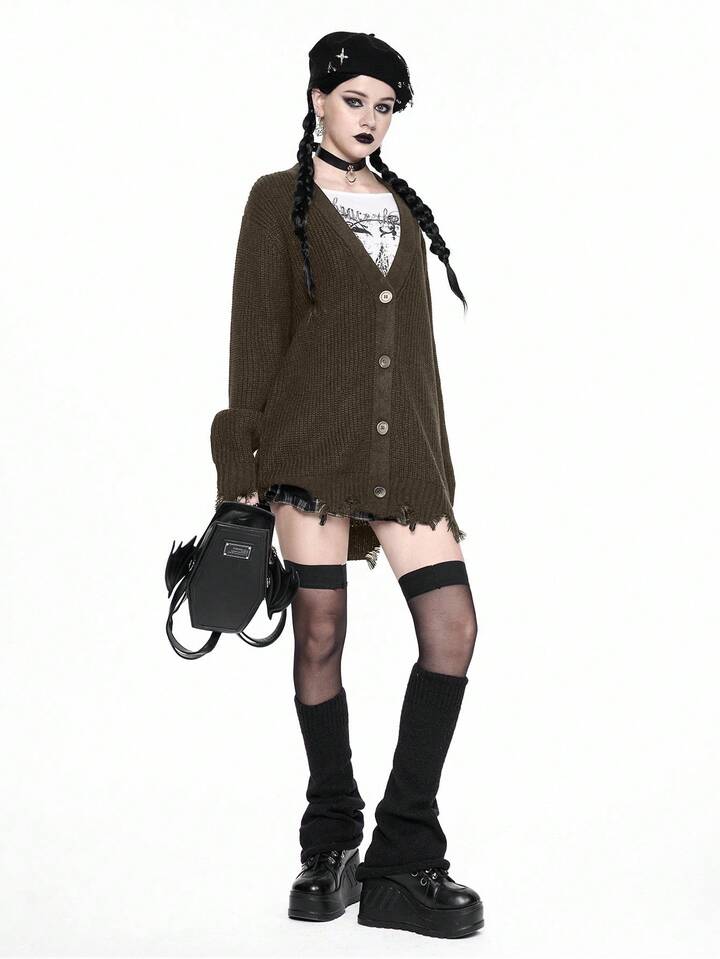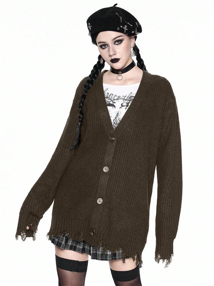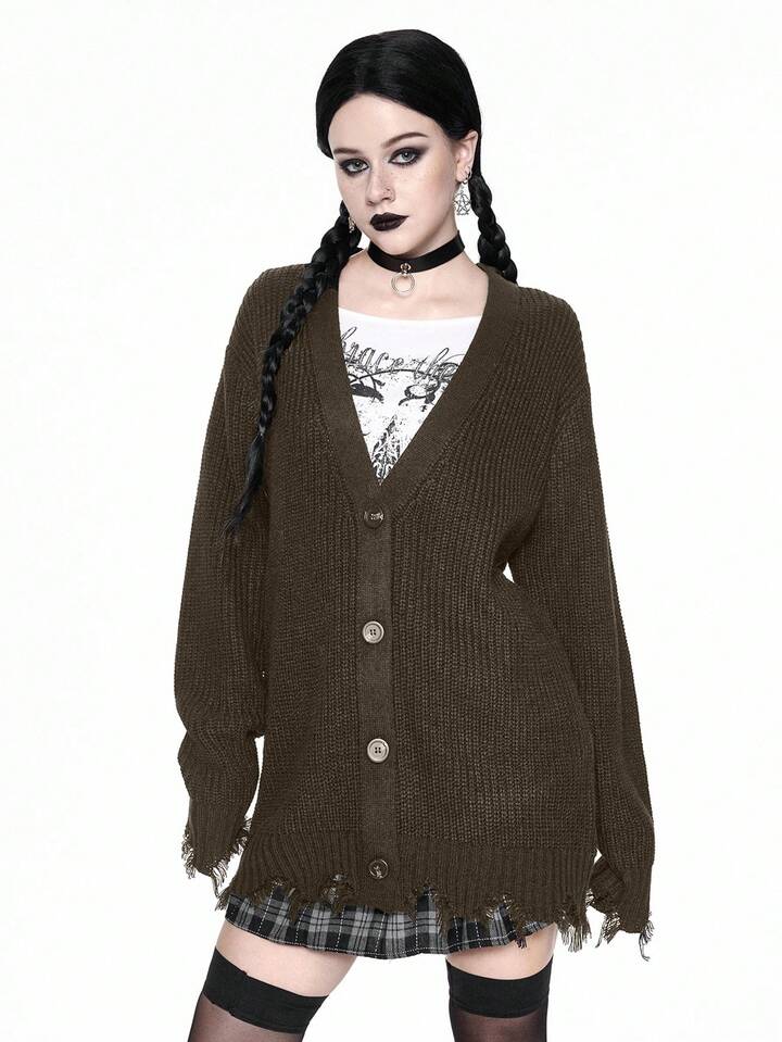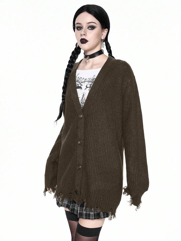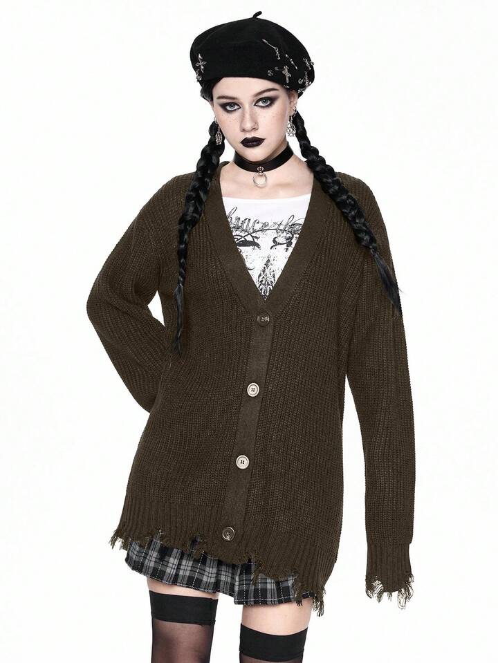 Goth Cardigan casual con scollo a V, orlo sfilacciato, maglia larga, stile gotico, adatto per autunno/inverno