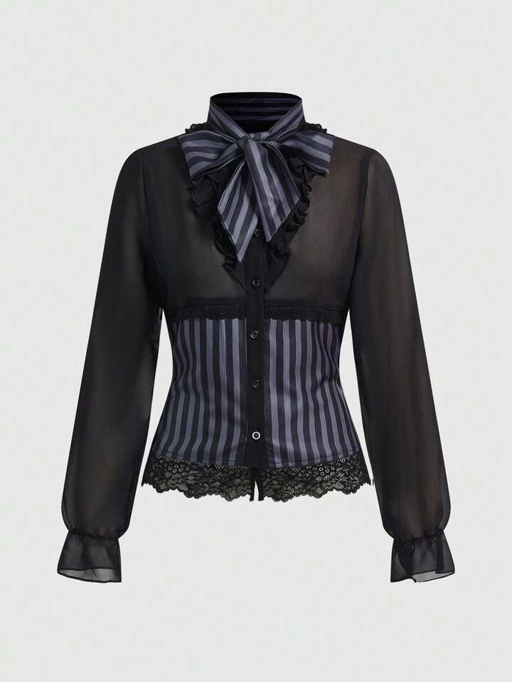 Goth Blusa gotica da donna in chiffon semi-trasparente a righe con fiocco