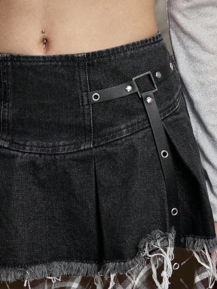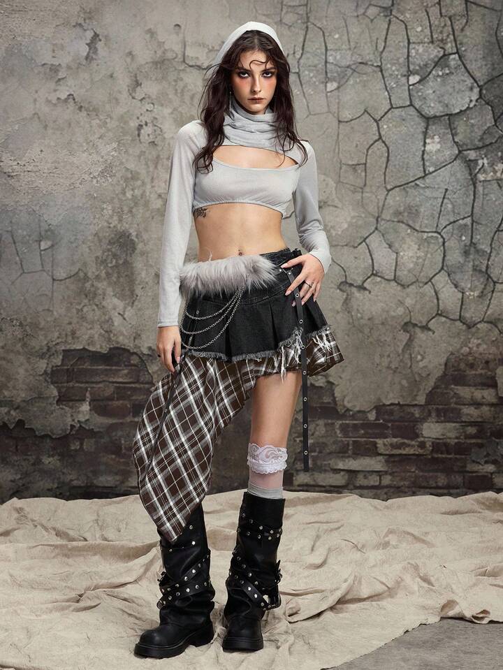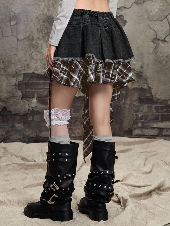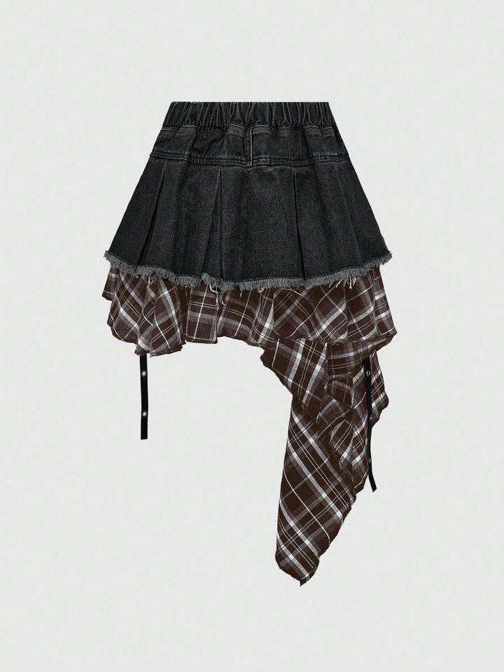 Goth Gonna mini asimmetrica in denim con patchwork e motivo a quadri in stile gotico per donna