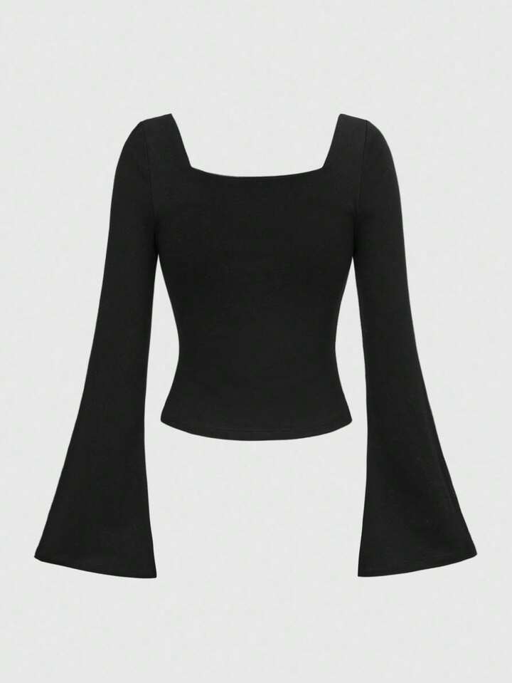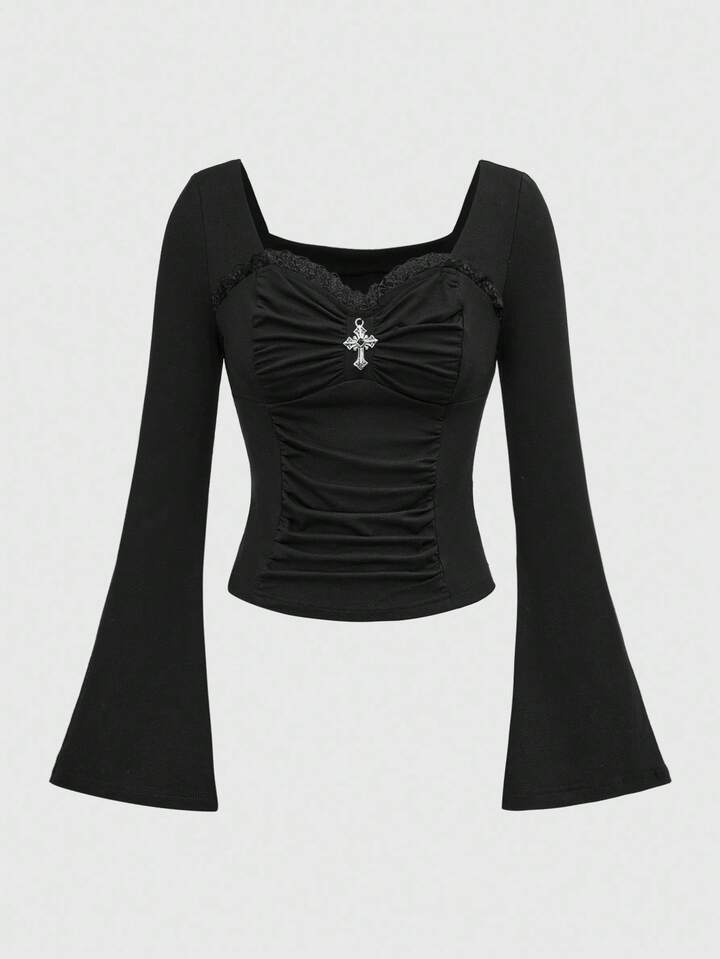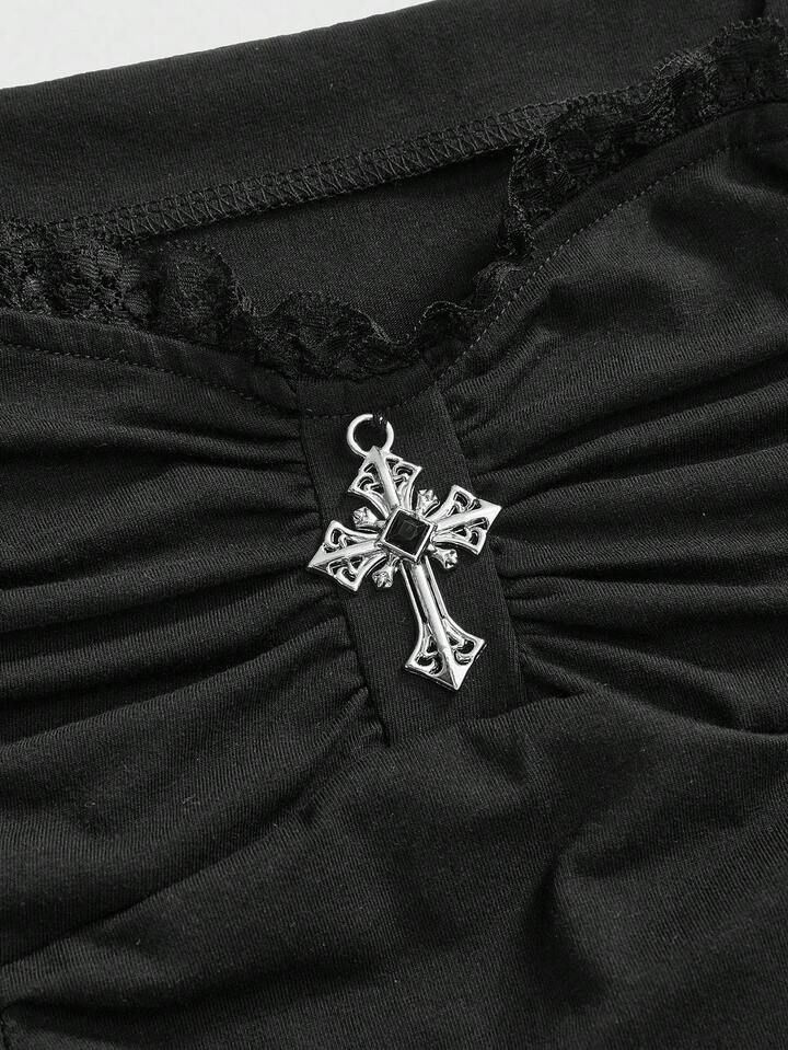 Goth Maglietta aderente da donna con maniche a sbuffo, arricciature e dettagli in pizzo a croce in stile gotico