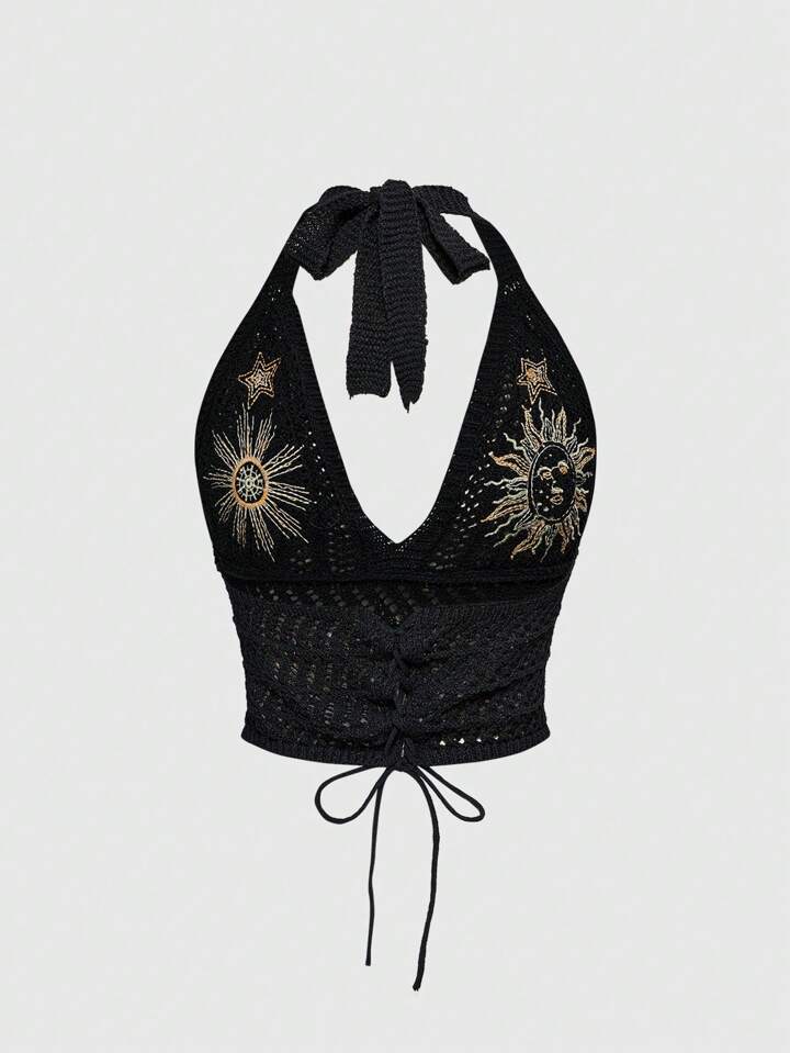 Hippie Blusa da donna in stile hippy boho con ricami a luna e stelle